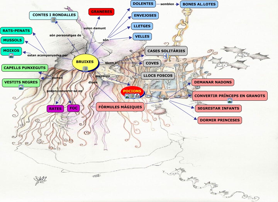 Este Cmap, tiene información relacionada con: presentació bruixes, POCIONS per CONVERTIR PRÍNCEPS EN GRANOTS, BRUIXES porten CAPELLS PUNXEGUTS, BRUIXES són ENVEJOSES, POCIONS per DORMIR PRINCESES, DOLENTES semblen BONES AL.LOTES, BRUIXES poden convertir-se en FOC, BRUIXES poden convertir-se en RATES, FÒRMULES MÀGIQUES per SEGRESTAR INFANTS, BRUIXES són personatges de CONTES I RONDALLES, BRUIXES porten CAPELLS PUNXEGUTS, BRUIXES viuen a LLOCS FOSCOS, BRUIXES volen damunt GRANERES, BRUIXES estan acompanyades per MOIXOS, BRUIXES són VELLES, BRUIXES viuen a CASES SOLITÀRIES, BRUIXES viuen a COVES, BRUIXES són LLETGES, BRUIXES estan acompanyades per MUSSOLS, BRUIXES diuen FÒRMULES MÀGIQUES, FÒRMULES MÀGIQUES per DORMIR PRINCESES