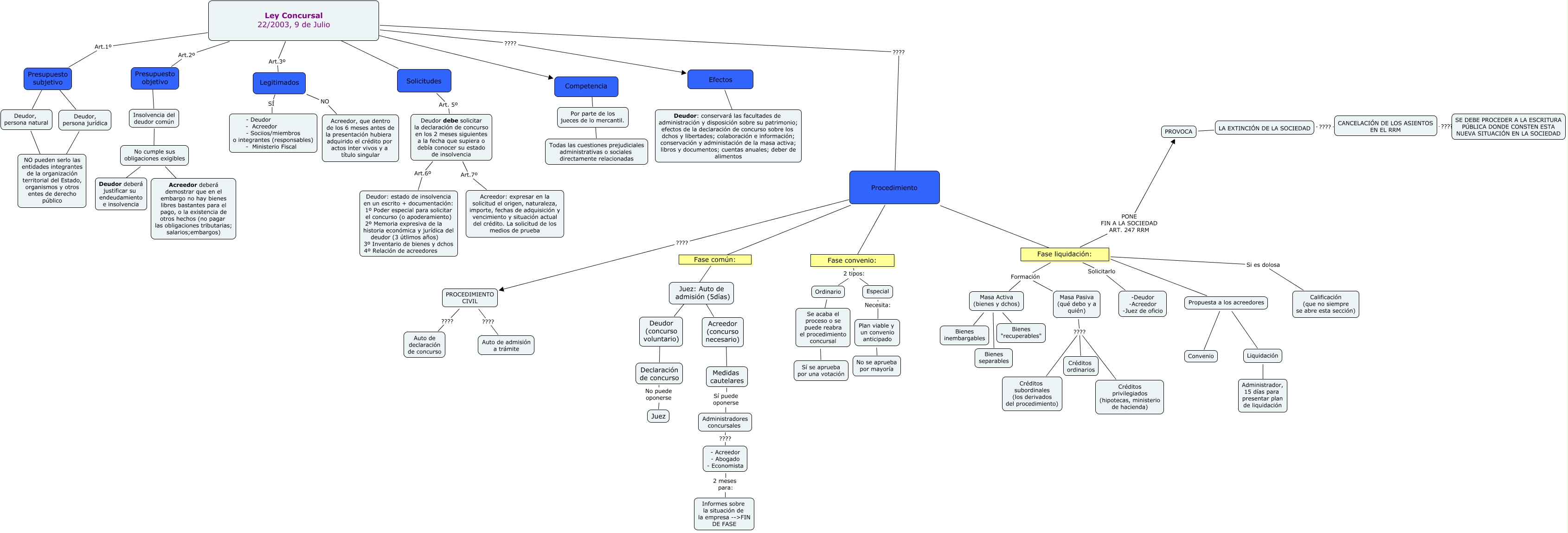 Este mapa conceptual tiene información relacionada a: Practica 10 RETOCADA, LA EXTINCIÓN DE LA SOCIEDAD ???? CANCELACIÓN DE LOS ASIENTOS EN EL RRM, Acreedor (concurso necesario) ???? Medidas cautelares, Efectos ???? Deudor: conservará las facultades de administración y disposición sobre su patrimonio; efectos de la declaración de concurso sobre los dchos y libertades; colaboración e información; conservación y administación de la masa activa; libros y documentos; cuentas anuales; deber de alimentos, Se acaba el proceso o se puede reabra el procedimiento concursal ???? Sí se aprueba por una votación, Presupuesto subjetivo ???? Deudor, persona natural, No cumple sus obligaciones exigibles ???? Acreedor deberá demostrar que en el embargo no hay bienes libres bastantes para el pago, o la existencia de otros hechos (no pagar las obligaciones tributarias; salarios;embargos), PROCEDIMIENTO CIVIL ???? Auto de declaración de concurso, Fase liquidación: ???? Propuesta a los acreedores, Solicitudes Art. 5º Deudor debe solicitar la declaración de concurso en los 2 meses siguientes a la fecha que supiera o debía conocer su estado de insolvencia, Fase liquidación: Formación Masa Activa (bienes y dchos), Presupuesto objetivo ???? Insolvencia del deudor común, Masa Activa (bienes y dchos) ???? Bienes separables, Insolvencia del deudor común ???? No cumple sus obligaciones exigibles, Competencia ???? Por parte de los jueces de lo mercantil., Deudor debe solicitar la declaración de concurso en los 2 meses siguientes a la fecha que supiera o debía conocer su estado de insolvencia Art.6º Deudor: estado de insolvencia en un escrito + documentación: 1º Poder especial para solicitar el concurso (o apoderamiento) 2º Memoria expresiva de la historia económica y jurídica del deudor (3 útlimos años) 3º Inventario de bienes y dchos 4º Relación de acreedores, Medidas cautelares Sí puede oponerse Administradores concursales, Ley Concursal 22/2003, 9 de Julio ???? Competencia, Deudor, persona jurídica ???? NO pueden serlo las entidades integrantes de la organización territorial del Estado, organismos y otros entes de derecho público, Ley Concursal 22/2003, 9 de Julio Art.3º Legitimados, Plan viable y un convenio anticipado ???? No se aprueba por mayoría