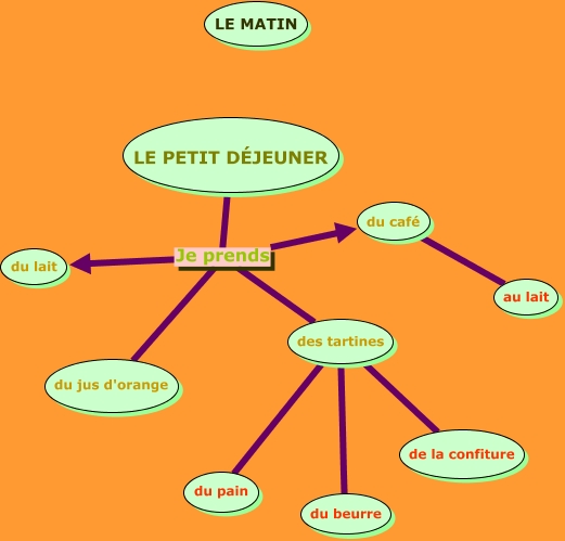 This Concept Map, created with IHMC CmapTools, has information related to: le matin, LE PETIT DÉJEUNER Je prends du lait, des tartines de la confiture, LE PETIT DÉJEUNER Je prends du café, LE PETIT DÉJEUNER Je prends des tartines, des tartines du pain, LE PETIT DÉJEUNER Je prends du jus d'orange, des tartines du beurre, du café au lait