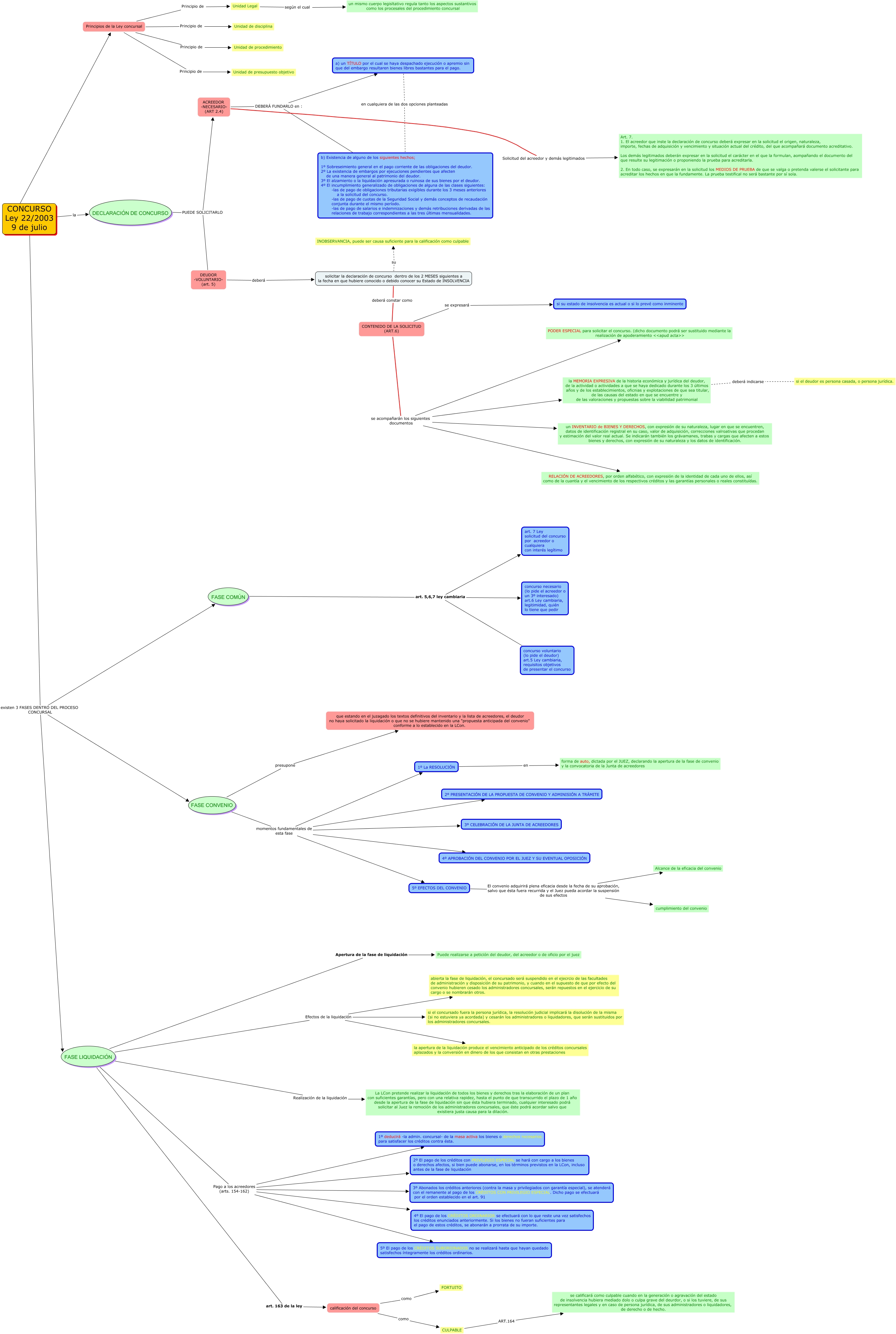 Este mapa conceptual tiene información relacionada a: practica 10, ACREEDOR -NECESARIO- (ART 2.4) Solicitud del acreedor y demás legitimados Art. 7. 1. El acreedor que inste la declaración de concurso deberá expresar en la solicitud el origen, naturaleza, importe, fechas de adquisición y vencimiento y situación actual del crédito, del que acompañará documento acreditativo. Los demás legitimados deberán expresar en la solicitud el carácter en el que la formulan, aompañando el documento del que resulte su legitimación o proponiendo la prueba para acreditarla. 2. En todo caso, se expresarán en la solicitud los MEDIOS DE PRUEBA de que se valga o pretenda valerse el solicitante para acreditar los hechos en que la fundamente. La prueba testifical no será bastante por sí sola., CONCURSO Ley 22/2003 9 de julio existen 3 FASES DENTRO DEL PROCESO CONCURSAL FASE CONVENIO, FASE LIQUIDACIÓN Pago a los acreedores (arts. 154-162) 4º El pago de los CRÉDITOS ORDINARIOS se efectuará con lo que reste una vez satisfechos los créditos enunciados anteriormente. Si los bienes no fueran suficientes para el pago de estos créditos, se abonarán a prorrata de su importe., Principios de la Ley concursal Principio de Unidad de disciplina, FASE COMÚN art. 5,6,7 ley cambiaria concurso necesario (lo pide el acreedor o un 3º interesado) art.6 Ley cambiaria, legitimidad, quién lo tiene que pedir, FASE LIQUIDACIÓN Pago a los acreedores (arts. 154-162) 1º deducirá -la admin. concursal- de la masa activa los bienes o derechos necesarios para satisfacer los créditos contra ésta., solicitar la declaración de concurso dentro de los 2 MESES siguientes a la fecha en que hubiere conocido o debido conocer su Estado de INSOLVENCIA su INOBSERVANCIA, puede ser causa suficiente para la calificación como culpable, Principios de la Ley concursal Principio de Unidad de presupuesto objetivo, FASE CONVENIO presupone que estando en el juzagado los textos definitivos del inventario y la lista de acreedores, el deudor no haya solicitado la liquidación o que no se hubiere mantenido una "propuesta anticipada del convenio" conforme a lo establecido en la LCon., DECLARACIÓN DE CONCURSO PUEDE SOLICITARLO ACREEDOR -NECESARIO- (ART 2.4), FASE CONVENIO momentos fundamentales de esta fase 4º APROBACIÓN DEL CONVENIO POR EL JUEZ Y SU EVENTUAL OPOSICIÓN, FASE LIQUIDACIÓN Efectos de la liquidación abierta la fase de liquidación, el concursado será suspendido en el ejecrcio de las facultades de administración y disposición de su patrimonio, y cuando en el supuesto de que por efecto del convenio hubieren cesado los administradores concursales, serán repuestos en el ejercicio de su cargo o se nombrarán otros., CONCURSO Ley 22/2003 9 de julio existen 3 FASES DENTRO DEL PROCESO CONCURSAL FASE COMÚN, FASE LIQUIDACIÓN Apertura de la fase de liquidación Puede realizarse a petición del deudor, del acreedor o de oficio por el juez, CONCURSO Ley 22/2003 9 de julio existen 3 FASES DENTRO DEL PROCESO CONCURSAL FASE LIQUIDACIÓN, Unidad Legal según el cual un mismo cuerpo legisltativo regula tanto los aspectos sustantivos como los procesales del procedimiento concursal, calificación del concurso como CULPABLE, solicitar la declaración de concurso dentro de los 2 MESES siguientes a la fecha en que hubiere conocido o debido conocer su Estado de INSOLVENCIA deberá constar como CONTENIDO DE LA SOLICITUD (ART.6), CULPABLE ART.164 se calificará como culpable cuando en la generación o agravación del estado de insolvencia hubiera mediado dolo o culpa grave del deurdor, o si los tuviere, de sus representantes legales y en caso de persona jurídica, de sus administradores o liquidadores, de derecho o de hecho., CONTENIDO DE LA SOLICITUD (ART.6) se expresará si su estado de insolvencia es actual o si lo prevé como inminente