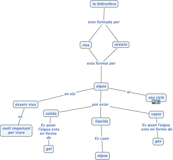 Este mapa conceptual tiene información relacionada a: la hidrosfera, aigua en els èssers vius, aigua el seu cicle, èssers vius es molt important per viure, vapor Es quan l'aigua esta en forma de gas, la hidrosfera esta formada per rius, aigua pot estar liquida, oceans esta format per aigua, aigua pot estar solida, la hidrosfera esta formada per oceans, rius esta format per aigua, solida Es quan l'aigua esta en forma de gel, aigua pot estar vapor, liquida Es cuan aigua