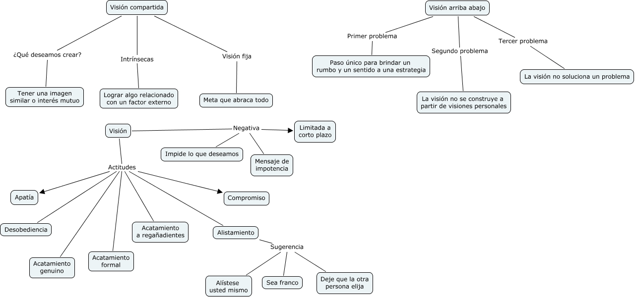 Este Cmap, tiene información relacionada con: Capítulo 11, Visión Negativa Impide lo que deseamos, Visión Actitudes Alistamiento, Visión Actitudes Acatamiento genuino, Visión Negativa Limitada a corto plazo, Visión compartida ¿Qué deseamos crear? Tener una imagen similar o interés mutuo, Visión Actitudes Compromiso, Visión compartida Intrínsecas Lograr algo relacionado con un factor externo, Visión arriba abajo Segundo problema La visión no se construye a partir de visiones personales, Alistamiento Sugerencia Sea franco, Visión Negativa Mensaje de impotencia, Visión Actitudes Acatamiento formal, Alistamiento Sugerencia Alístese usted mismo, Visión compartida Visión fija Meta que abraca todo, Visión arriba abajo Primer problema Paso único para brindar un rumbo y un sentido a una estrategia, Visión Actitudes Acatamiento a regañadientes, Visión arriba abajo Tercer problema La visión no soluciona un problema, Alistamiento Sugerencia Deje que la otra persona elija, Visión Actitudes Apatía, Visión Actitudes Desobediencia