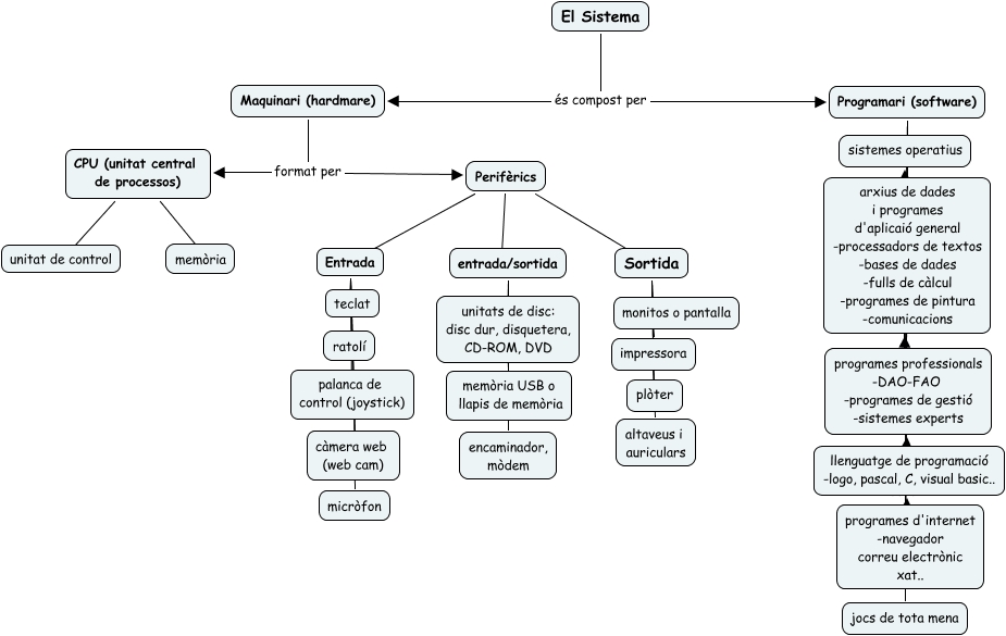 Este mapa conceptual tiene información relacionada a: tecno, Programari (software) ???? llenguatge de programació -logo, pascal, C, visual basic.., CPU (unitat central de processos) ???? unitat de control, Perifèrics ???? Entrada, Maquinari (hardmare) format per Perifèrics, Programari (software) ???? programes d'internet -navegador correu electrònic xat.., entrada/sortida ???? unitats de disc: disc dur, disquetera, CD-ROM, DVD, El Sistema és compost per Programari (software), entrada/sortida ???? encaminador, mòdem, El Sistema és compost per Maquinari (hardmare), Sortida ???? impressora, Entrada ???? micròfon, Programari (software) ???? jocs de tota mena, Entrada ???? palanca de control (joystick), Sortida ???? monitos o pantalla, Programari (software) ???? programes professionals -DAO-FAO -programes de gestió -sistemes experts, Maquinari (hardmare) format per CPU (unitat central de processos), entrada/sortida ???? unitats de disc: disc dur, disquetera, CD-ROM, DVD, Entrada ???? teclat, Programari (software) ???? arxius de dades i programes d'aplicaió general -processadors de textos -bases de dades -fulls de càlcul -programes de pintura -comunicacions, Sortida ???? altaveus i auriculars