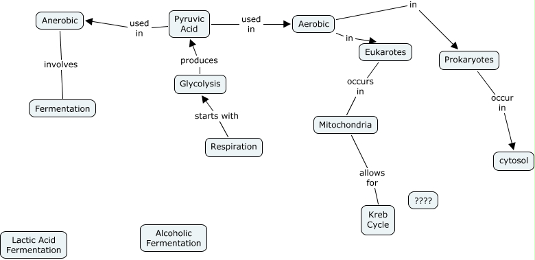 This Concept Map, created with IHMC CmapTools, has information related to: Respiration, Prokaryotes occur in cytosol, Anerobic involves Fermentation, Aerobic in Prokaryotes, Glycolysis produces Pyruvic Acid, Mitochondria allows for Kreb Cycle, Eukarotes occurs in Mitochondria, Aerobic in Eukarotes, Respiration starts with Glycolysis, Pyruvic Acid used in Anerobic, Pyruvic Acid used in Aerobic