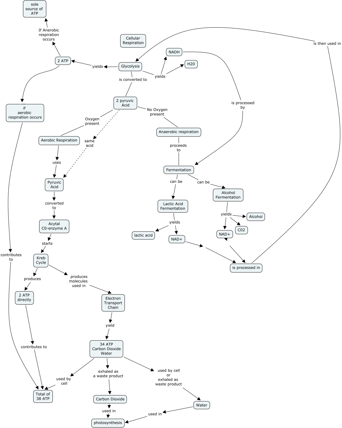 This Concept Map, created with IHMC CmapTools, has information related to: Untitled 1, Electron Transport Chain yield 34 ATP Carbon Dioxide Water, Lactic Acid Fermentation yields NAD+, Aerobic Respiration uses Pyruvic Acid, Kreb Cycle produces molecules used in Electron Transport Chain, 2 pyruvic Acid same acid Pyruvic Acid, NAD+ is processed in, Fermentation can be Alcohol Fermentation, 34 ATP Carbon Dioxide Water exhaled as a waste product Carbon Dioxide, if aerobic respiration occurs contributes to Total of 38 ATP, NAD+ is processed in, Lactic Acid Fermentation yields lactic acid, Acytal C0-enzyme A starts Kreb Cycle, Alcohol Fermentation yields NAD+, Glycolysis yields H20, 2 ATP if aerobic respiration occurs, 2 pyruvic Acid No Oxygen present Anaerobic respiration, 34 ATP Carbon Dioxide Water used by cell or exhaled as waste product Water, is processed in is then used in Glycolysis, Glycolysis is converted to 2 pyruvic Acid, Fermentation can be Lactic Acid Fermentation