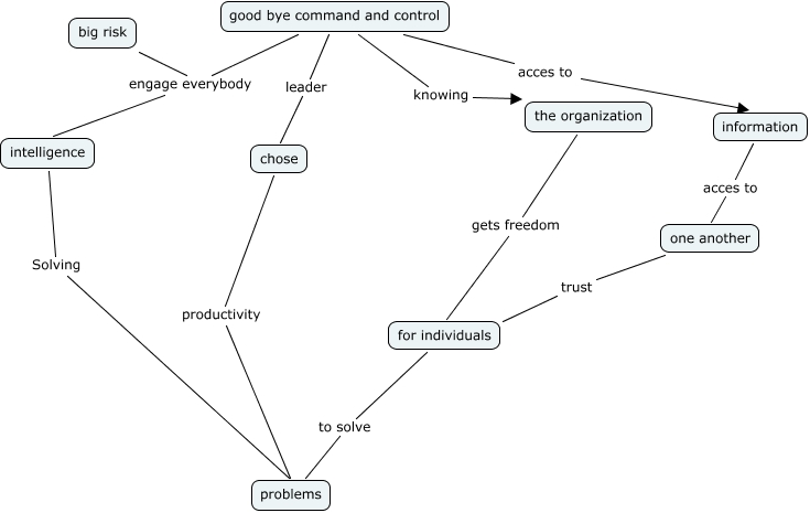 Este Cmap, tiene información relacionada con: good bye comand and control, good bye command and control leader chose, chose productivity problems, big risk engage everybody intelligence, one another trust for individuals, information acces to one another, good bye command and control engage everybody intelligence, the organization gets freedom for individuals, for individuals to solve problems, good bye command and control knowing the organization, intelligence Solving problems, good bye command and control acces to information