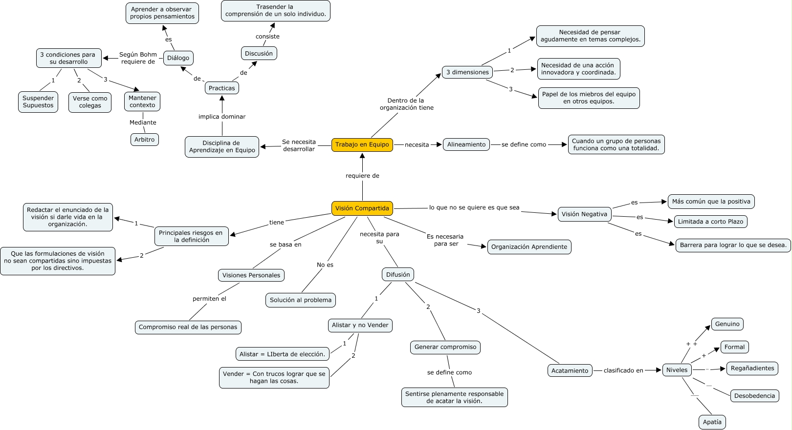 Este Cmap, tiene información relacionada con: Actividad Clase 6, Niveles --- Apatía, Mantener contexto Mediante Arbitro, Principales riesgos en la definición 2 Que las formulaciones de visión no sean compartidas sino impuestas por los directivos., Visión Compartida se basa en Visiones Personales, Practicas de Discusión, 3 dimensiones 3 Papel de los miebros del equipo en otros equipos., Alistar y no Vender 2 Vender = Con trucos lograr que se hagan las cosas., Visión Compartida requiere de Trabajo en Equipo, 3 condiciones para su desarrollo 3 Mantener contexto, Practicas de Diálogo, 3 condiciones para su desarrollo 1 Suspender Supuestos, Niveles - Regañadientes, Difusión 2 Generar compromiso, Alistar y no Vender 1 Alistar = LIberta de elección., Visión Compartida lo que no se quiere es que sea Visión Negativa, Visión Compartida No es Solución al problema, Visión Negativa es Más común que la positiva, Disciplina de Aprendizaje en Equipo implica dominar Practicas, Niveles + Formal, Diálogo es Aprender a observar propios pensamientos