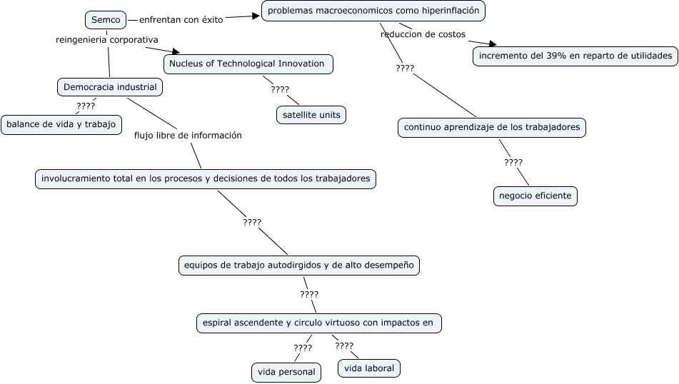 Este Cmap, tiene información relacionada con: Semler, problemas macroeconomicos como hiperinflación ???? continuo aprendizaje de los trabajadores, problemas macroeconomicos como hiperinflación reduccion de costos incremento del 39% en reparto de utilidades, involucramiento total en los procesos y decisiones de todos los trabajadores ???? equipos de trabajo autodirgidos y de alto desempeño, Semco reingenieria corporativa Nucleus of Technological Innovation, espiral ascendente y circulo virtuoso con impactos en ???? vida personal, espiral ascendente y circulo virtuoso con impactos en ???? vida laboral, equipos de trabajo autodirgidos y de alto desempeño ???? espiral ascendente y circulo virtuoso con impactos en, Semco enfrentan con éxito problemas macroeconomicos como hiperinflación, Semco reingenieria corporativa Democracia industrial, Democracia industrial ???? balance de vida y trabajo, Democracia industrial flujo libre de información involucramiento total en los procesos y decisiones de todos los trabajadores, continuo aprendizaje de los trabajadores ???? negocio eficiente, Nucleus of Technological Innovation ???? satellite units