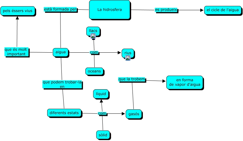 Este mapa conceptual tiene información relacionada a: L'hidrosfera, aigua que podem trobar-la en diferents estats, diferents estats com líquid, aigua que és molt important pels éssers vius, La hidrosfera està formada per aigua, gasós que la trobem en forma de vapor d'aigua, aigua com oceans, La hidrosfera es produeix el cicle de l'aigua, aigua com llacs, diferents estats com sòlid, diferents estats com gasós, aigua com rius