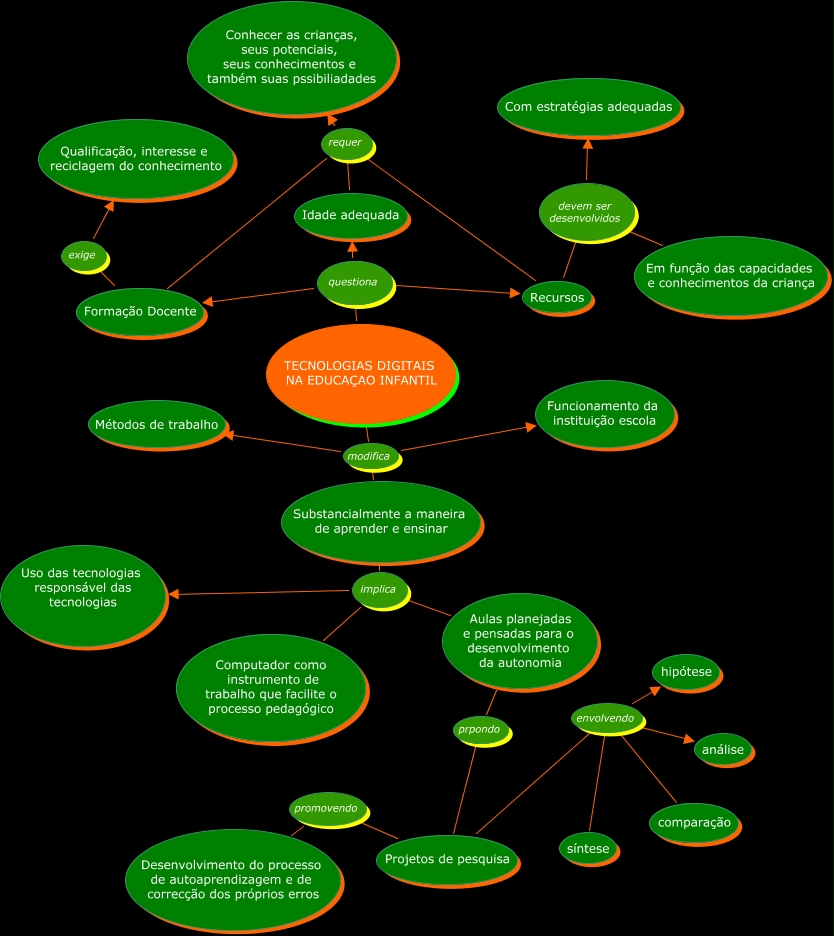 Esse mapa conceitual, produzido no IHMC CmapTools, tem a informação relacionada a: PAmundodigital2008.02, Idade adequada requer Conhecer as crianças, seus potenciais, seus conhecimentos e também suas pssibiliadades, Recursos devem ser desenvolvidos Em função das capacidades e conhecimentos da criança, TECNOLOGIAS DIGITAIS NA EDUCAÇAO INFANTIL questiona Recursos, Projetos de pesquisa envolvendo comparação, Projetos de pesquisa promovendo Desenvolvimento do processo de autoaprendizagem e de correcção dos próprios erros, TECNOLOGIAS DIGITAIS NA EDUCAÇAO INFANTIL modifica Funcionamento da instituição escola, Recursos requer Formação Docente, Projetos de pesquisa envolvendo síntese, Projetos de pesquisa envolvendo análise, Aulas planejadas e pensadas para o desenvolvimento da autonomia prpondo Projetos de pesquisa, Substancialmente a maneira de aprender e ensinar implica Aulas planejadas e pensadas para o desenvolvimento da autonomia, Substancialmente a maneira de aprender e ensinar implica Uso das tecnologias responsável das tecnologias, TECNOLOGIAS DIGITAIS NA EDUCAÇAO INFANTIL questiona Formação Docente, TECNOLOGIAS DIGITAIS NA EDUCAÇAO INFANTIL modifica Substancialmente a maneira de aprender e ensinar, Recursos requer Conhecer as crianças, seus potenciais, seus conhecimentos e também suas pssibiliadades, Projetos de pesquisa envolvendo hipótese, TECNOLOGIAS DIGITAIS NA EDUCAÇAO INFANTIL modifica Métodos de trabalho, Idade adequada requer Formação Docente, Recursos devem ser desenvolvidos Com estratégias adequadas, TECNOLOGIAS DIGITAIS NA EDUCAÇAO INFANTIL questiona Idade adequada