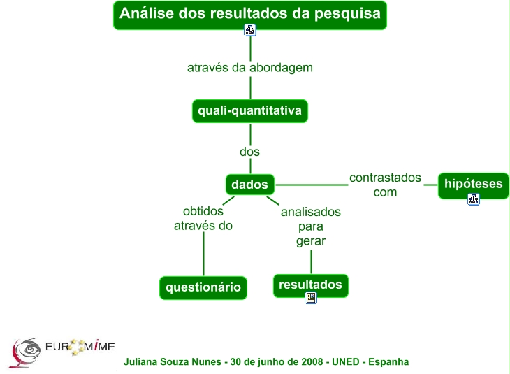 Esse mapa conceitual, produzido no IHMC CmapTools, tem a informação relacionada a: apres10 resultados graf, dados contrastados com hipóteses, quali-quantitativa dos dados, dados obtidos através do questionário, Análise dos resultados da pesquisa através da abordagem quali-quantitativa, dados analisados para gerar resultados