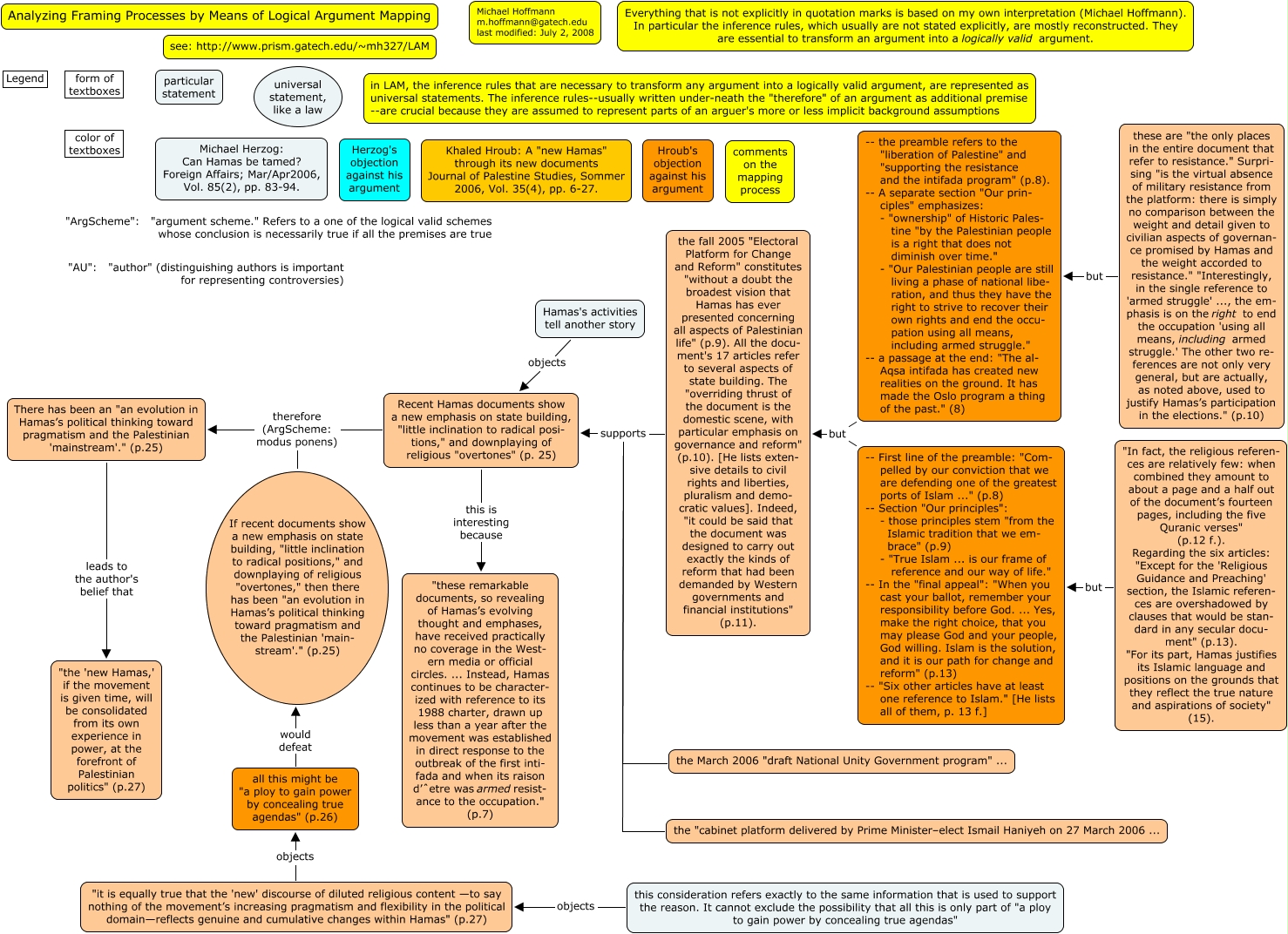 This Concept Map, created with IHMC CmapTools, has information related to: Hroub with criticism, -- the preamble refers to the "liberation of Palestine" and "supporting the resistance and the intifada program" (p.8). -- A separate section "Our prin- ciples" emphasizes: - "ownership" of Historic Pales- tine "by the Palestinian people is a right that does not diminish over time." - "Our Palestinian people are still living a phase of national libe- ration, and thus they have the right to strive to recover their own rights and end the occu- pation using all means, including armed struggle." -- a passage at the end: "The al- Aqsa intifada has created new realities on the ground. It has made the Oslo program a thing of the past." (8) but the fall 2005 "Electoral Platform for Change and Reform" constitutes "without a doubt the broadest vision that Hamas has ever presented concerning all aspects of Palestinian life" (p.9). All the docu- ment's 17 articles refer to several aspects of state building. The "overriding thrust of the document is the domestic scene, with particular emphasis on governance and reform" (p.10). [He lists exten- sive details to civil rights and liberties, pluralism and demo- cratic values]. Indeed, "it could be said that the document was designed to carry out exactly the kinds of reform that had been demanded by Western governments and financial institutions" (p.11)., the fall 2005 "Electoral Platform for Change and Reform" constitutes "without a doubt the broadest vision that Hamas has ever presented concerning all aspects of Palestinian life" (p.9). All the docu- ment's 17 articles refer to several aspects of state building. The "overriding thrust of the document is the domestic scene, with particular emphasis on governance and reform" (p.10). [He lists exten- sive details to civil rights and liberties, pluralism and demo- cratic values]. Indeed, "it could be said that the document was designed to carry out exactly the kinds of reform that had been demanded by Western governments and financial institutions" (p.11). supports Recent Hamas documents show a new emphasis on state building, "little inclination to radical posi- tions," and downplaying of religious "overtones" (p. 25), "In fact, the religious referen- ces are relatively few: when combined they amount to about a page and a half out of the document’s fourteen pages, including the five Quranic verses" (p.12 f.). Regarding the six articles: "Except for the 'Religious Guidance and Preaching' section, the Islamic referen- ces are overshadowed by clauses that would be stan- dard in any secular docu- ment" (p.13). "For its part, Hamas justifies its Islamic language and positions on the grounds that they reflect the true nature and aspirations of society" (15). but -- First line of the preamble: "Com- pelled by our conviction that we are defending one of the greatest ports of Islam ..." (p.8) -- Section "Our principles": - those principles stem "from the Islamic tradition that we em- brace" (p.9) - "True Islam ... is our frame of reference and our way of life." -- In the "final appeal": "When you cast your ballot, remember your responsibility before God. ... Yes, make the right choice, that you may please God and your people, God willing. Islam is the solution, and it is our path for change and reform" (p.13) -- "Six other articles have at least one reference to Islam." [He lists all of them, p. 13 f.], these are "the only places in the entire document that refer to resistance." Surpri- sing "is the virtual absence of military resistance from the platform: there is simply no comparison between the weight and detail given to civilian aspects of governan- ce promised by Hamas and the weight accorded to resistance." "Interestingly, in the single reference to 'armed struggle' ..., the em- phasis is on the right to end the occupation 'using all means, including armed struggle.' The other two re- ferences are not only very general, but are actually, as noted above, used to justify Hamas’s participation in the elections." (p.10) but -- the preamble refers to the "liberation of Palestine" and "supporting the resistance and the intifada program" (p.8). -- A separate section "Our prin- ciples" emphasizes: - "ownership" of Historic Pales- tine "by the Palestinian people is a right that does not diminish over time." - "Our Palestinian people are still living a phase of national libe- ration, and thus they have the right to strive to recover their own rights and end the occu- pation using all means, including armed struggle." -- a passage at the end: "The al- Aqsa intifada has created new realities on the ground. It has made the Oslo program a thing of the past." (8), Recent Hamas documents show a new emphasis on state building, "little inclination to radical posi- tions," and downplaying of religious "overtones" (p. 25) therefore (ArgScheme: modus ponens) There has been an "an evolution in Hamas’s political thinking toward pragmatism and the Palestinian 'mainstream'." (p.25), Recent Hamas documents show a new emphasis on state building, "little inclination to radical posi- tions," and downplaying of religious "overtones" (p. 25) this is interesting because "these remarkable documents, so revealing of Hamas’s evolving thought and emphases, have received practically no coverage in the West- ern media or official circles. ... Instead, Hamas continues to be character- ized with reference to its 1988 charter, drawn up less than a year after the movement was established in direct response to the outbreak of the first inti- fada and when its raison d’ˆetre was armedresist- ance to the occupation." (p.7), Hamas's activities tell another story objects Recent Hamas documents show a new emphasis on state building, "little inclination to radical posi- tions," and downplaying of religious "overtones" (p. 25), all this might be "a ploy to gain power by concealing true agendas" (p.26) would defeat If recent documents show a new emphasis 