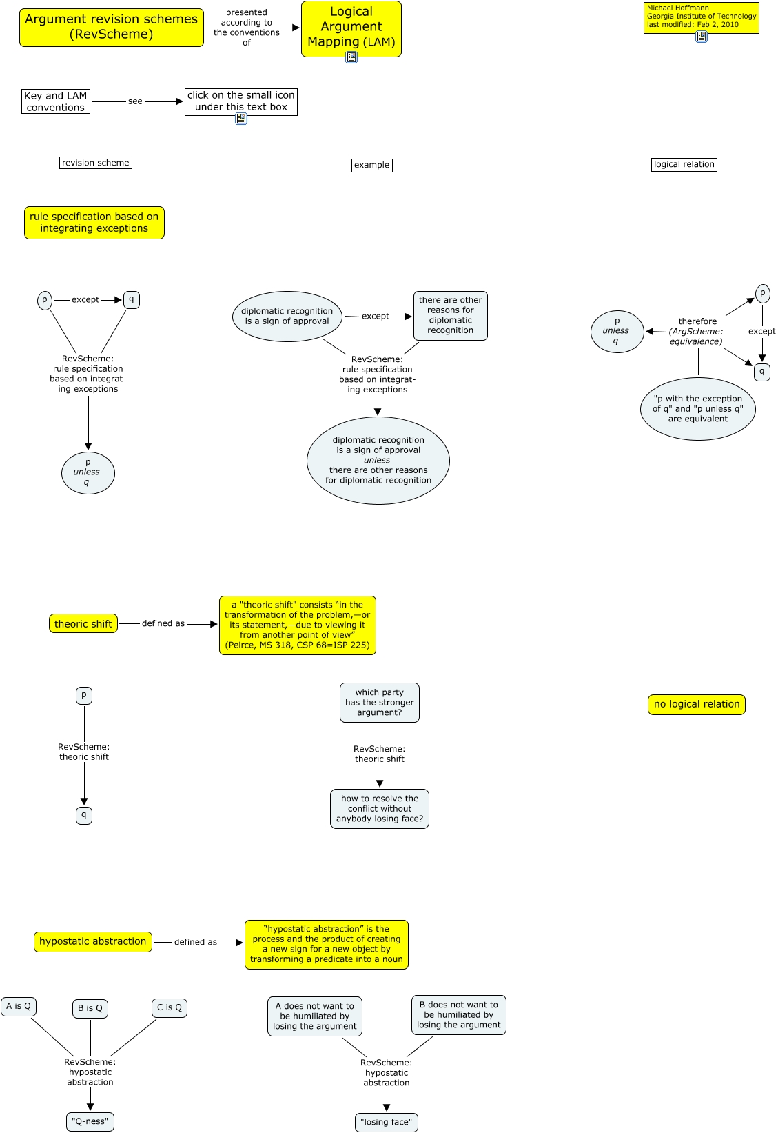This Concept Map, created with IHMC CmapTools, has information related to: argument revision schemes, "p with the exception of q" and "p unless q" are equivalent therefore (ArgScheme: equivalence) p, diplomatic recognition is a sign of approval except there are other reasons for diplomatic recognition, hypostatic abstraction defined as “hypostatic abstraction” is the process and the product of creating a new sign for a new object by transforming a predicate into a noun, B does not want to be humiliated by losing the argument RevScheme: hypostatic abstraction "losing face", A is Q RevScheme: hypostatic abstraction "Q-ness", p RevScheme: rule specification based on integrat- ing exceptions p unless q, q RevScheme: rule specification based on integrat- ing exceptions p unless q, which party has the stronger argument? RevScheme: theoric shift how to resolve the conflict without anybody losing face?, C is Q RevScheme: hypostatic abstraction "Q-ness", Key and LAM conventions see click on the small icon under this text box, diplomatic recognition is a sign of approval RevScheme: rule specification based on integrat- ing exceptions diplomatic recognition is a sign of approval unless there are other reasons for diplomatic recognition, theoric shift defined as a "theoric shift" consists “in the transformation of the problem,—or its statement,—due to viewing it from another point of view” (Peirce, MS 318, CSP 68=ISP 225), "p with the exception of q" and "p unless q" are equivalent therefore (ArgScheme: equivalence) p unless q, Argument revision schemes (RevScheme) presented according to the conventions of Logical Argument Mapping (LAM), p RevScheme: theoric shift q, A does not want to be humiliated by losing the argument RevScheme: hypostatic abstraction "losing face", "p with the exception of q" and "p unless q" are equivalent therefore (ArgScheme: equivalence) q, p except q, p except q, there are other reasons for diplomatic recognition RevScheme: rule specification based on integrat- ing exceptions diplomatic recognition is a sign of approval unless there are other reasons for diplomatic recognition