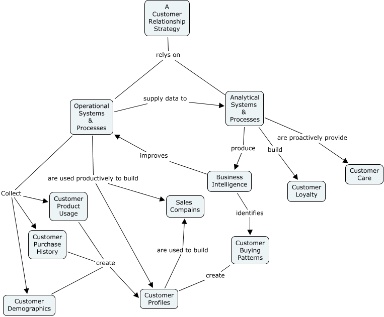 SSmith Revised, Business Intelligence improves Operational Systems & Processes, Operational Systems & Processes are used productively to build Sales Compains, Analytical Systems & Processes build Customer Loyalty, Analytical Systems & Processes produce Business Intelligence, Customer Purchase History create Customer Profiles, Customer Product Usage create Customer Profiles, Operational Systems & Processes supply data to Analytical Systems & Processes, Customer Buying Patterns create Customer Profiles, Analytical Systems & Processes are proactively provide Customer Care, Operational Systems & Processes are used productively to build Customer Profiles