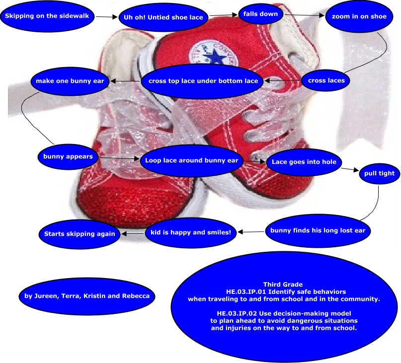 This Concept Map, created with IHMC CmapTools, has information related to: Shoelaces, bunny appears Loop lace around bunny ear, Skipping on the sidewalk Uh oh! Untied shoe lace, bunny finds his long lost ear kid is happy and smiles!, Loop lace around bunny ear Lace goes into hole, cross laces cross top lace under bottom lace, zoom in on shoe cross laces, Uh oh! Untied shoe lace falls down, Lace goes into hole pull tight, pull tight bunny finds his long lost ear, make one bunny ear bunny appears, cross top lace under bottom lace make one bunny ear, falls down zoom in on shoe, kid is happy and smiles! Starts skipping again