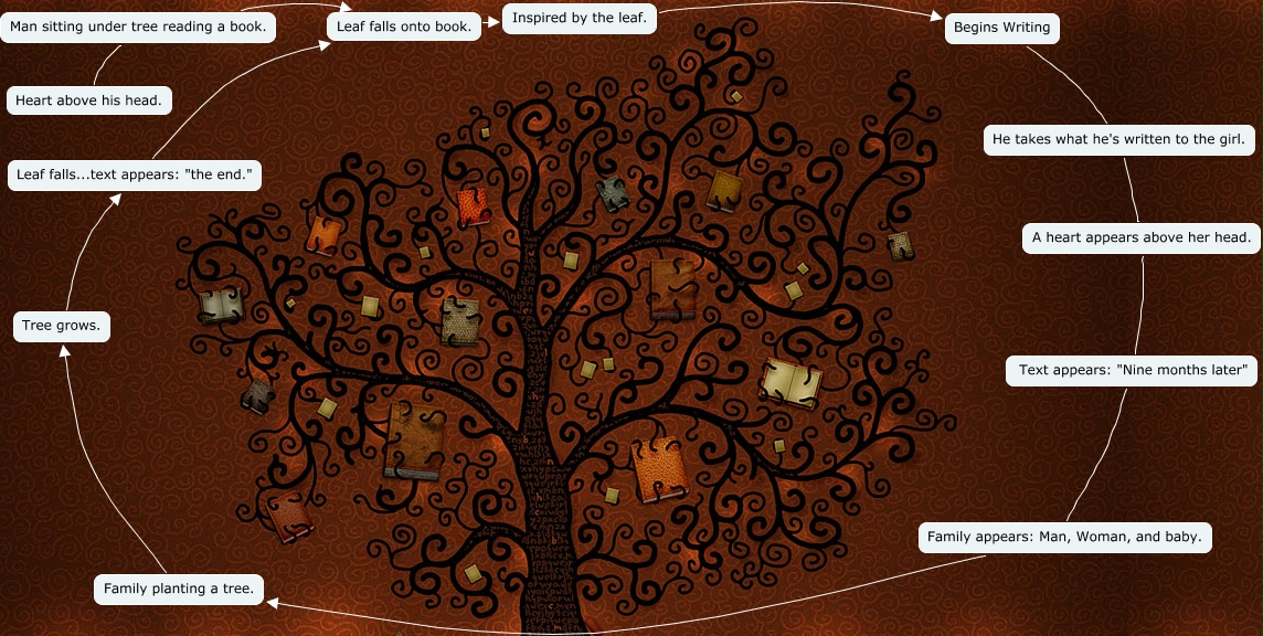 This Concept Map, created with IHMC CmapTools, has information related to: LifeCycle, Begins Writing He takes what he's written to the girl., Tree grows. Leaf falls...text appears: "the end.", Man sitting under tree reading a book. Heart above his head., Family appears: Man, Woman, and baby. Family planting a tree., Leaf falls onto book. Inspired by the leaf., He takes what he's written to the girl. A heart appears above her head., A heart appears above her head. Text appears: "Nine months later", Text appears: "Nine months later" Family appears: Man, Woman, and baby., Leaf falls...text appears: "the end." Leaf falls onto book., Inspired by the leaf. Begins Writing, Man sitting under tree reading a book. Leaf falls onto book., Family planting a tree. Tree grows.