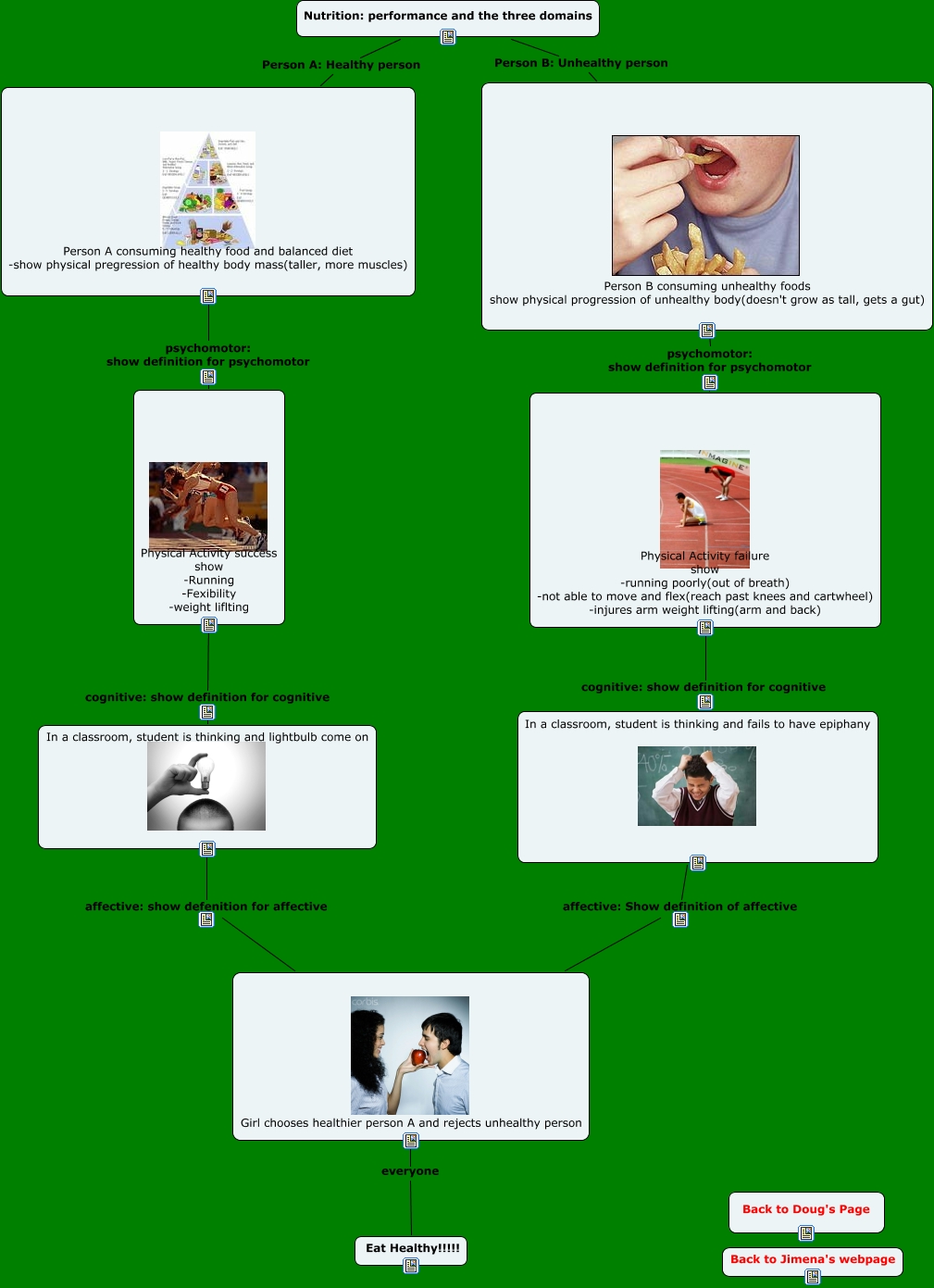 This Concept Map, created with IHMC CmapTools, has information related to: Untitled 1, Girl chooses healthier person A and rejects unhealthy person everyone Eat Healthy!!!!!, Physical Activity success show -Running -Fexibility -weight liflting cognitive: show definition for cognitive In a classroom, student is thinking and lightbulb come on, In a classroom, student is thinking and fails to have epiphany affective: Show definition of affective Girl chooses healthier person A and rejects unhealthy person, Person A consuming healthy food and balanced diet -show physical pregression of healthy body mass(taller, more muscles) psychomotor: show definition for psychomotor Physical Activity success show -Running -Fexibility -weight liflting, Physical Activity failure show -running poorly(out of breath) -not able to move and flex(reach past knees and cartwheel) -injures arm weight lifting(arm and back) cognitive: show definition for cognitive In a classroom, student is thinking and fails to have epiphany, Nutrition: performance and the three domains Person A: Healthy person Person A consuming healthy food and balanced diet -show physical pregression of healthy body mass(taller, more muscles), In a classroom, student is thinking and lightbulb come on affective: show defenition for affective Girl chooses healthier person A and rejects unhealthy person, Person B consuming unhealthy foods show physical progression of unhealthy body(doesn't grow as tall, gets a gut) psychomotor: show definition for psychomotor Physical Activity failure show -running poorly(out of breath) -not able to move and flex(reach past knees and cartwheel) -injures arm weight lifting(arm and back), Nutrition: performance and the three domains Person B: Unhealthy person Person B consuming unhealthy foods show physical progression of unhealthy body(doesn't grow as tall, gets a gut)