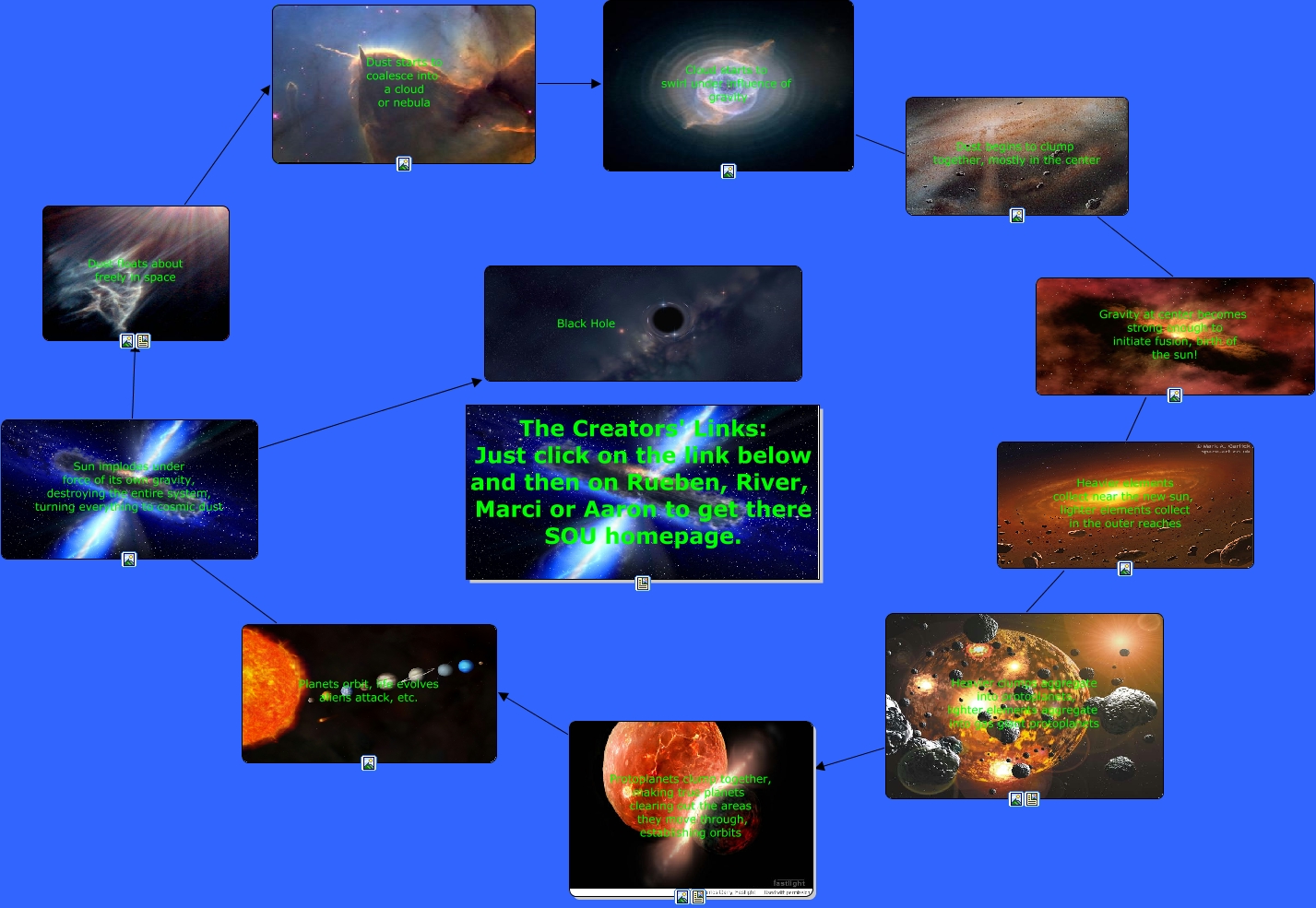 This Concept Map, created with IHMC CmapTools, has information related to: Solar system cycle, A star is born!, Heavier elements collect near the new sun, lighter elements collect in the outer reaches Heavier clumps aggregate into protoplanets, lighter elements aggregate into gas giant protoplanets, Sun implodes under force of its own gravity, destroying the entire system, turning everything to cosmic dust Black Hole, Cloud starts to swirl under influence of gravity Dust begins to clump together, mostly in the center, Sun implodes under force of its own gravity, destroying the entire system, turning everything to cosmic dust Dust floats about freely in space, Gravity at center becomes strong enough to initiate fusion, birth of the sun! Heavier elements collect near the new sun, lighter elements collect in the outer reaches, Dust starts to coalesce into a cloud or nebula Cloud starts to swirl under influence of gravity, Heavier clumps aggregate into protoplanets, lighter elements aggregate into gas giant protoplanets Protoplanets clump together, making true planets clearing out the areas they move through, establishing orbits, Protoplanets clump together, making true planets clearing out the areas they move through, establishing orbits Planets orbit, life evolves aliens attack, etc., Dust begins to clump together, mostly in the center Gravity at center becomes strong enough to initiate fusion, birth of the sun!, Dust floats about freely in space Dust starts to coalesce into a cloud or nebula, Planets orbit, life evolves aliens attack, etc. ???? Sun implodes under force of its own gravity, destroying the entire system, turning everything to cosmic dust