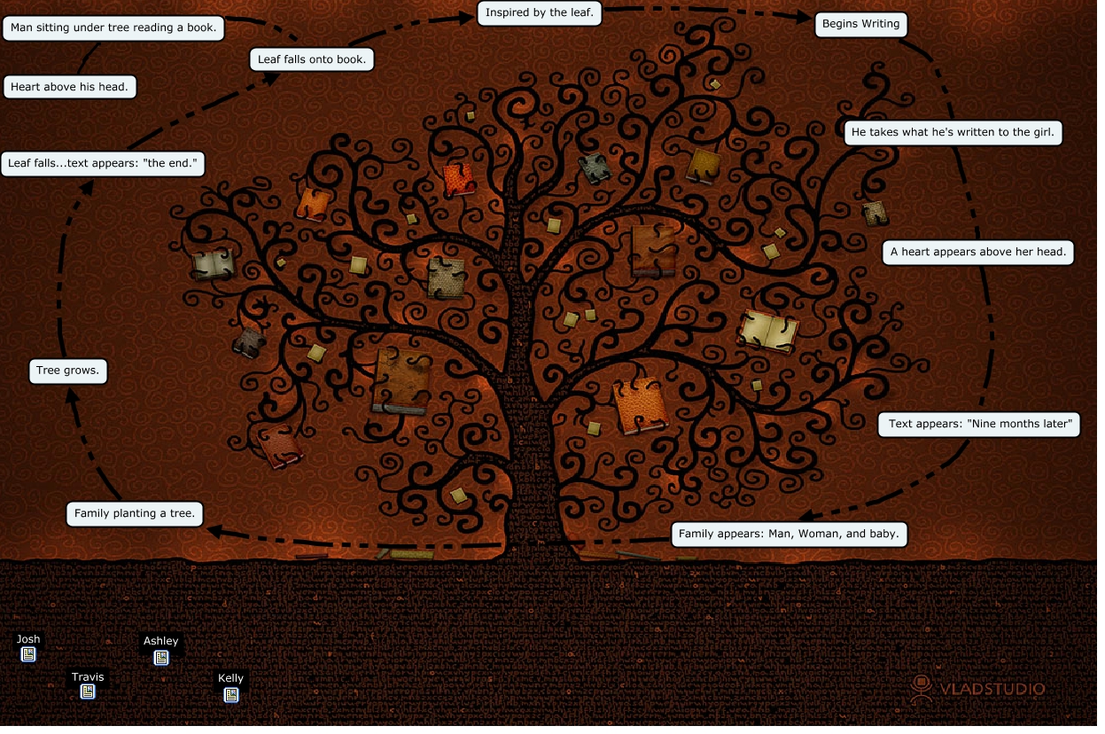 This Concept Map, created with IHMC CmapTools, has information related to: LifeCycle2, Leaf falls onto book. Inspired by the leaf., Text appears: "Nine months later" Family appears: Man, Woman, and baby., Leaf falls...text appears: "the end." Leaf falls onto book., A heart appears above her head. Text appears: "Nine months later", Family appears: Man, Woman, and baby. Family planting a tree., Begins Writing He takes what he's written to the girl., He takes what he's written to the girl. A heart appears above her head., Inspired by the leaf. Begins Writing, Man sitting under tree reading a book. Leaf falls onto book., Tree grows. Leaf falls...text appears: "the end.", Man sitting under tree reading a book. Heart above his head., Family planting a tree. Tree grows.