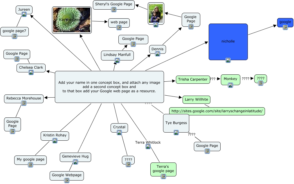This Concept Map, created with IHMC CmapTools, has information related to: WED AM MAP, Tye Burgess ???? Google Page, Add your name in one concept box, and attach any image add a second concept box and to that box add your Google web page as a resource. ???? Tye Burgess, Jureen google page7, Trisha Carpenter ???? Monkey, Larry Willhite http://sites.google.com/site/larryschangeinlatitude/, nicholle google, Add your name in one concept box, and attach any image add a second concept box and to that box add your Google web page as a resource. Larry Willhite, Rebecca Morehouse Google Page, Google Page Sheryl, Add your name in one concept box, and attach any image add a second concept box and to that box add your Google web page as a resource. Dennis, Tye Burgess ???? Google Page, Add your name in one concept box, and attach any image add a second concept box and to that box add your Google web page as a resource. Kristin Rohay, Genevieve Hug Google Webpage, Monkey ???? ????, Add your name in one concept box, and attach any image add a second concept box and to that box add your Google web page as a resource. Jureen, Crystal ????, Add your name in one concept box, and attach any image add a second concept box and to that box add your Google web page as a resource. ???? Rebecca Morehouse, Add your name in one concept box, and attach any image add a second concept box and to that box add your Google web page as a resource. Kaytee Leeper, Add your name in one concept box, and attach any image add a second concept box and to that box add your Google web page as a resource. Genevieve Hug, Add your name in one concept box, and attach any image add a second concept box and to that box add your Google web page as a resource. ???? Chelsea Clark