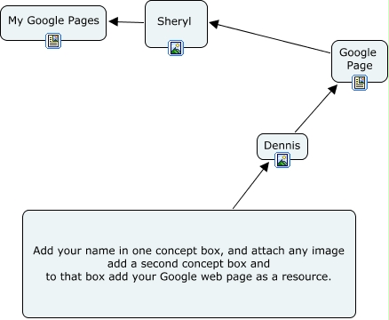 This Concept Map, created with IHMC CmapTools, has information related to: Sheryl Zimmerer, Sheryl My Google Pages, Google Page Sheryl, Add your name in one concept box, and attach any image add a second concept box and to that box add your Google web page as a resource. Dennis, Dennis Google Page