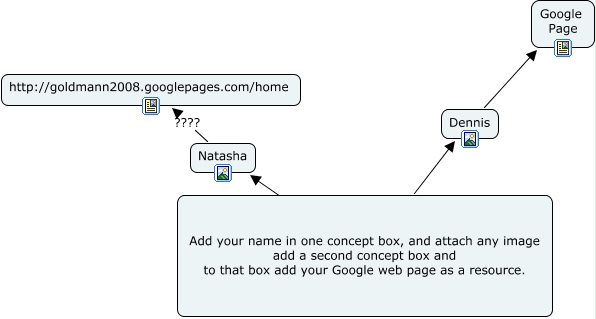 This Concept Map, created with IHMC CmapTools, has information related to: Untitled, Add your name in one concept box, and attach any image add a second concept box and to that box add your Google web page as a resource. ???? Natasha, Natasha ???? http://goldmann2008.googlepages.com/home, Add your name in one concept box, and attach any image add a second concept box and to that box add your Google web page as a resource. Dennis, Dennis Google Page
