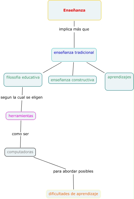 Este mapa conceptual tiene información relacionada a: Magdalena Balbi Virginia Montans - 2, Enseñanza implica más que enseñanza tradicional, computadoras para abordar posibles dificultades de aprendizaje, enseñanza tradicional enseñanza constructiva, herramientas como ser computadoras, filosofia educativa segun la cual se eligen herramientas, enseñanza tradicional aprendizajes, enseñanza tradicional filosofia educativa