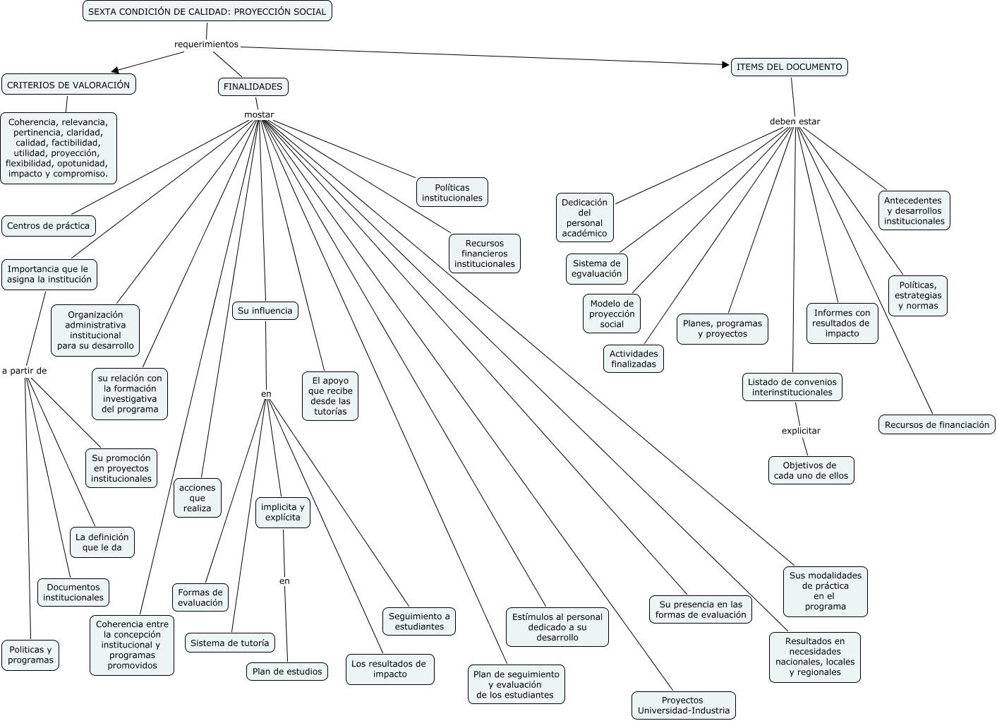 Este Cmap, tiene información relacionada con: SEXTA CONDICION DE CALIDAD COMO SE TRABAJA LA CONDICION DE CALIDAD. ANGELA, FINALIDADES mostar su relación con la formación investigativa del programa, ITEMS DEL DOCUMENTO deben estar Recursos de financiación, ITEMS DEL DOCUMENTO deben estar Políticas, estrategias y normas, FINALIDADES mostar Centros de práctica, FINALIDADES mostar Organización administrativa institucional para su desarrollo, FINALIDADES mostar Importancia que le asigna la institución, ITEMS DEL DOCUMENTO deben estar Dedicación del personal académico, SEXTA CONDICIÓN DE CALIDAD: PROYECCIÓN SOCIAL requerimientos CRITERIOS DE VALORACIÓN, FINALIDADES mostar Su influencia, FINALIDADES mostar Resultados en necesidades nacionales, locales y regionales, FINALIDADES mostar Proyectos Universidad-Industria, ITEMS DEL DOCUMENTO deben estar Actividades finalizadas, FINALIDADES mostar acciones que realiza, Su influencia en Seguimiento a estudiantes, Su influencia en Los resultados de impacto, FINALIDADES mostar Estímulos al personal dedicado a su desarrollo, Listado de convenios interinstitucionales explicitar Objetivos de cada uno de ellos, FINALIDADES mostar El apoyo que recibe desde las tutorías, FINALIDADES mostar Plan de seguimiento y evaluación de los estudiantes, implicita y explícita en Plan de estudios