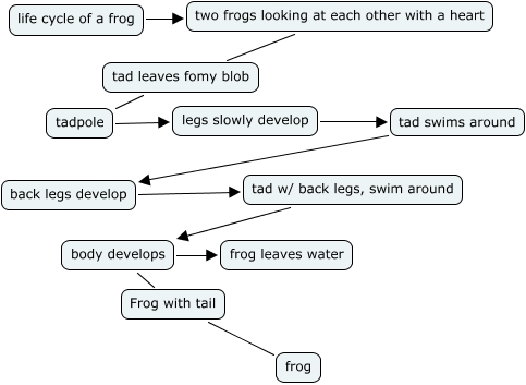 This Concept Map, created with IHMC CmapTools, has information related to: life of a frog, back legs develop tad w/ back legs, swim around, body develops Frog with tail, legs slowly develop tad swims around, body develops frog leaves water, tad swims around back legs develop, two frogs looking at each other with a heart tad leaves fomy blob, tad leaves fomy blob tadpole, Frog with tail frog, tad w/ back legs, swim around body develops, life cycle of a frog two frogs looking at each other with a heart, tadpole legs slowly develop
