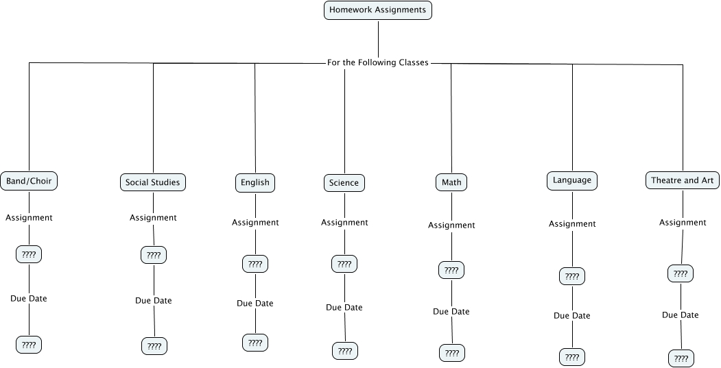 This Concept Map, created with IHMC CmapTools, has information related to: Assignment Planner, English Assignment ????, Band/Choir Assignment ????, ???? Due Date ????, Homework Assignments For the Following Classes English, Social Studies Assignment ????, ???? Due Date ????, ???? Due Date ????, Homework Assignments For the Following Classes Science, Homework Assignments For the Following Classes Social Studies, Science Assignment ????, Homework Assignments For the Following Classes Band/Choir, Language Assignment ????, Homework Assignments For the Following Classes Math, Math Assignment ????, ???? Due Date ????, ???? Due Date ????, ???? Due Date ????, Theatre and Art Assignment ????, Homework Assignments For the Following Classes Language, ???? Due Date ????