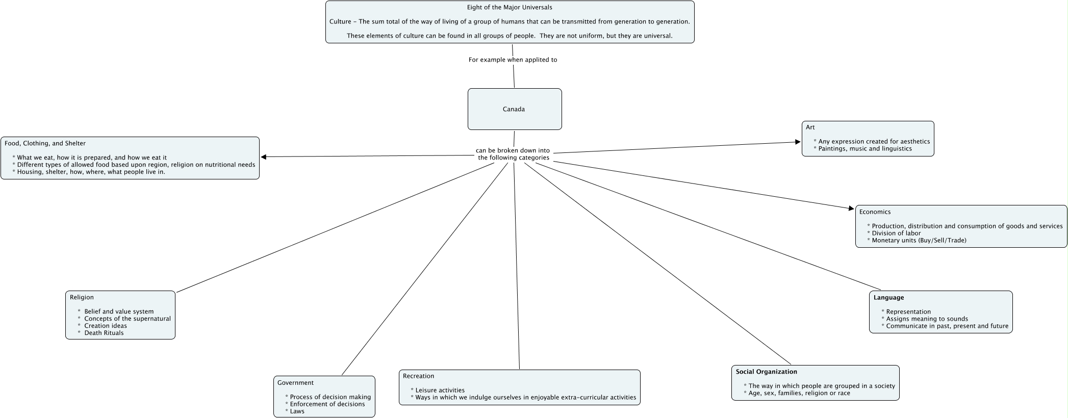 This Concept Map, created with IHMC CmapTools, has information related to: Cultural Universals, Eight of the Major Universals Culture - The sum total of the way of living of a group of humans that can be transmitted from generation to generation. These elements of culture can be found in all groups of people. They are not uniform, but they are universal. For example when applited to Canada, Canada can be broken down into the following categories Language * Representation * Assigns meaning to sounds * Communicate in past, present and future, Canada can be broken down into the following categories Social Organization * The way in which people are grouped in a society * Age, sex, families, religion or race, Canada can be broken down into the following categories Food, Clothing, and Shelter * What we eat, how it is prepared, and how we eat it * Different types of allowed food based upon region, religion on nutritional needs * Housing, shelter, how, where, what people live in., Canada can be broken down into the following categories Recreation * Leisure activities * Ways in which we indulge ourselves in enjoyable extra-curricular activities, Canada can be broken down into the following categories Religion * Belief and value system * Concepts of the supernatural * Creation ideas * Death Rituals, Canada can be broken down into the following categories Government * Process of decision making * Enforcement of decisions * Laws, Canada can be broken down into the following categories Art * Any expression created for aesthetics * Paintings, music and linguistics, Canada can be broken down into the following categories Economics * Production, distribution and consumption of goods and services * Division of labor * Monetary units (Buy/Sell/Trade)