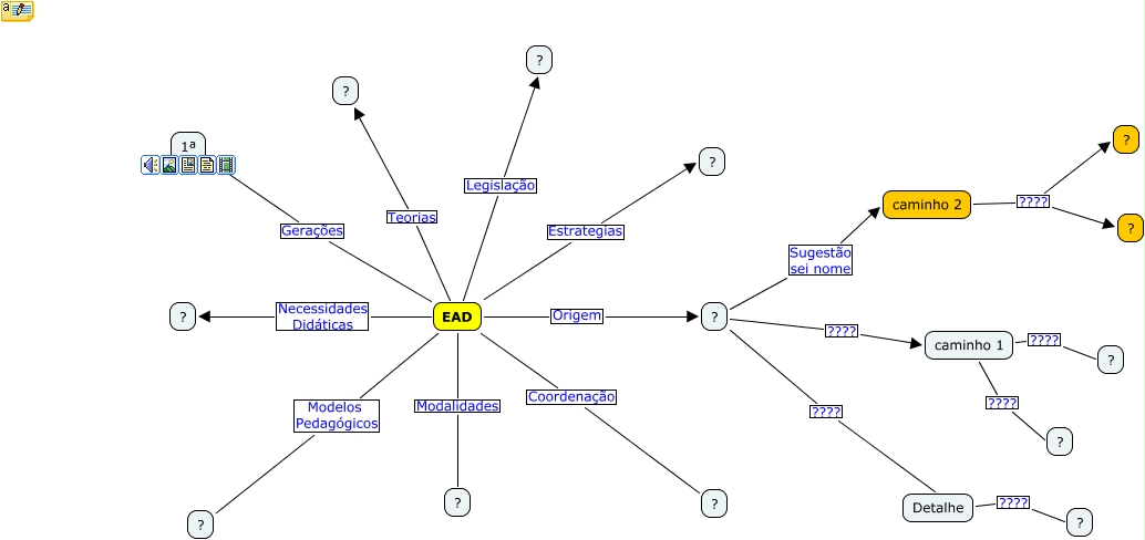Esse mapa conceitual, produzido no IHMC CmapTools, tem a informação relacionada a: EAD, caminho 2 ???? ?, ? Sugestão sei nome caminho 2, EAD Necessidades Didáticas ?, EAD Modelos Pedagógicos ?, caminho 2 ???? ?, Detalhe ???? ?, EAD Origem ?, ? ???? Detalhe, ? ???? caminho 1, caminho 1 ???? ?, EAD Modalidades ?, EAD Estrategias ?, EAD Teorias ?, caminho 1 ???? ?, EAD Coordenação ?, EAD Legislação ?, EAD Gerações 1ª