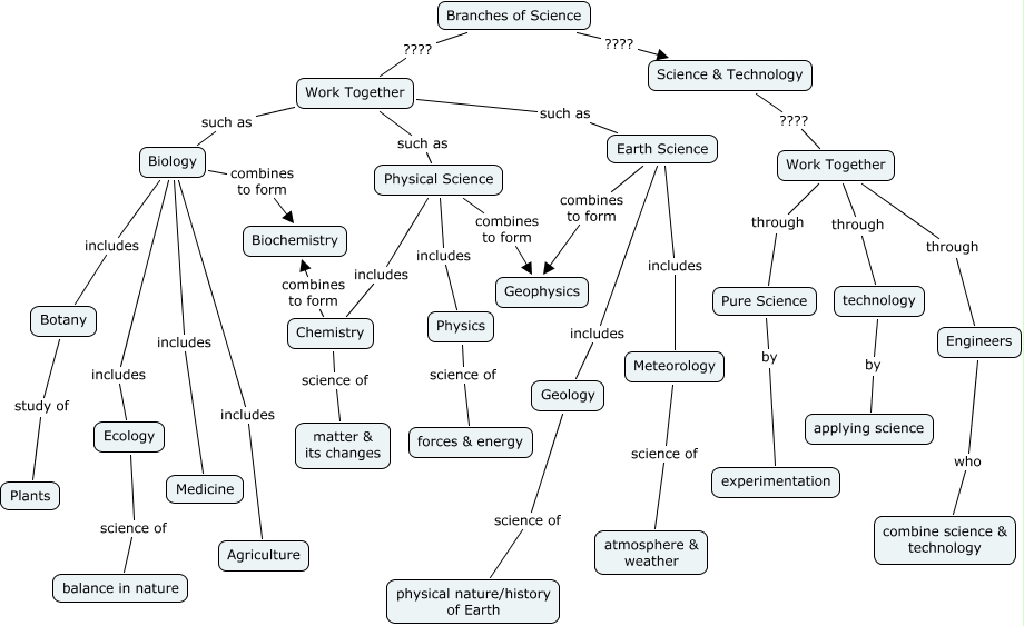 branches of science, Work Together such as Physical Science, Biology includes Botany, Biology includes Agriculture, Meteorology science of atmosphere & weather, Engineers who combine science & technology, Work Together through technology, Biology combines to form Biochemistry, Physical Science combines to form Geophysics, Botany study of Plants, Ecology science of balance in nature