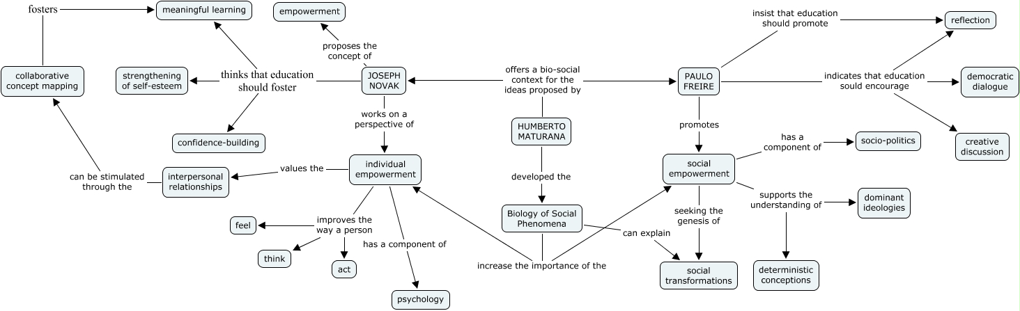 Esse mapa conceitual, produzido no IHMC CmapTools, tem a informação relacionada a: Empowerment Novak Freire, individual empowerment has a component of psychology, Biology of Social Phenomena increase the importance of the social empowerment, JOSEPH NOVAK thinks that education should foster strengthening of self-esteem, HUMBERTO MATURANA developed the Biology of Social Phenomena, interpersonal relationships can be stimulated through the collaborative concept mapping, JOSEPH NOVAK works on a perspective of individual empowerment, JOSEPH NOVAK thinks that education should foster meaningful learning, PAULO FREIRE indicates that education sould encourage reflection, PAULO FREIRE promotes social empowerment, social empowerment has a component of socio-politics, social empowerment supports the understanding of dominant ideologies, individual empowerment values the interpersonal relationships, JOSEPH NOVAK proposes the concept of empowerment, Biology of Social Phenomena can explain social transformations, JOSEPH NOVAK thinks that education should foster confidence-building, individual empowerment improves the way a person feel, social empowerment supports the understanding of deterministic conceptions, social empowerment seeking the genesis of social transformations, Biology of Social Phenomena increase the importance of the individual empowerment, individual empowerment improves the way a person act
