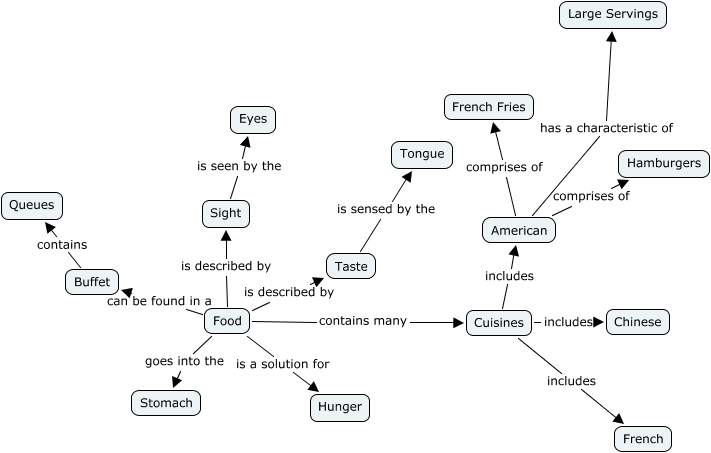 This Concept Map has information related to: Food, Food can be found in a Buffet, Buffet contains Queues, Food goes into the Stomach, Cuisines includes American, American comprises of Hamburgers, Cuisines includes Chinese, Cuisines includes French, American has a characteristic of Large Servings, American comprises of French Fries, Food is described by Sight