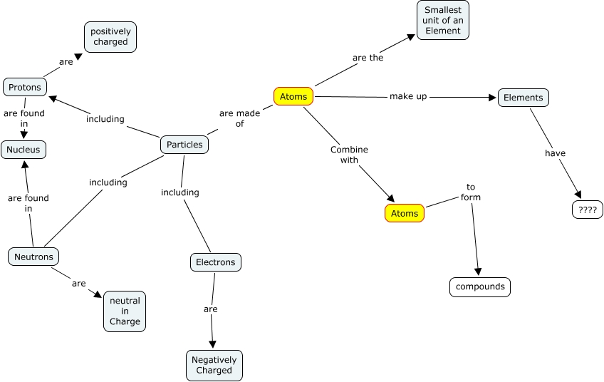 This Concept Map, created with IHMC CmapTools, has information related to: atoms, Atoms are the Smallest unit of an Element, Elements have ????, Neutrons are found in Nucleus, Atoms Combine with Atoms, Particles including Protons, Particles including Neutrons, Particles including Electrons, Protons are positively charged, Atoms are made of Particles, Neutrons are neutral in Charge, Atoms make up Elements, Atoms to form compounds, Electrons are Negatively Charged, Protons are found in Nucleus