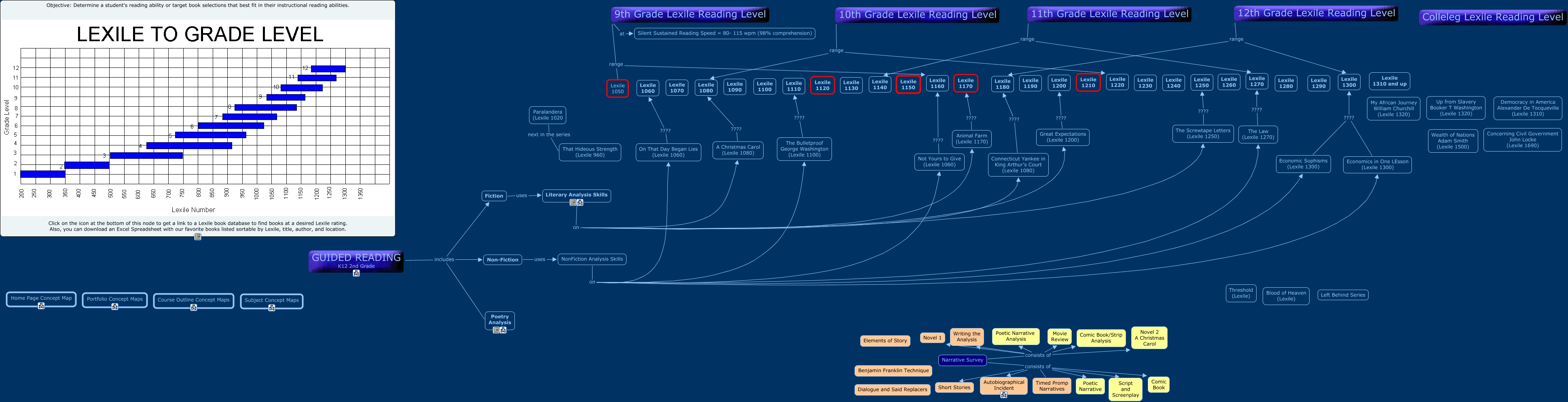 This Concept Map, created with IHMC CmapTools, has information related to: High School Literature, On That Day Began Lies (Lexile 1060) ???? Lexile 1060, GUIDED READING K12 2nd Grade includes Poetry Analysis, 9th Grade Lexile Reading Level range Lexile 1160, Literary Analysis Skills on The Screwtape Letters (Lexile 1250), The Law (Lexile 1270) ???? Lexile 1270, Not Yours to Give (Lexile 1060) ???? Lexile 1160, Narrative Survey consists of Short Stories, 11th Grade Lexile Reading Level range Lexile 1270, The Bulletproof George Washington (Lexile 1100) ???? Lexile 1110, Economics in One LEsson (Lexile 1300) ???? Lexile 1300, Great Expectations (Lexile 1200) ???? Lexile 1200, Narrative Survey consists of Comic Book/Strip Analysis, Literary Analysis Skills on Connecticut Yankee in King Arthur's Court (Lexile 1080), 9th Grade Lexile Reading Level at Silent Sustained Reading Speed = 80- 115 wpm (98% comprehension), GUIDED READING K12 2nd Grade includes Non-Fiction, 11th Grade Lexile Reading Level range Lexile 1140, Paralandera (Lexile 1020 next in the series That Hideous Strength (Lexile 960), Connecticut Yankee in King Arthur's Court (Lexile 1080) ???? Lexile 1180, GUIDED READING K12 2nd Grade includes Fiction, NonFiction Analysis Skills on Economic Sophisms (Lexile 1300)
