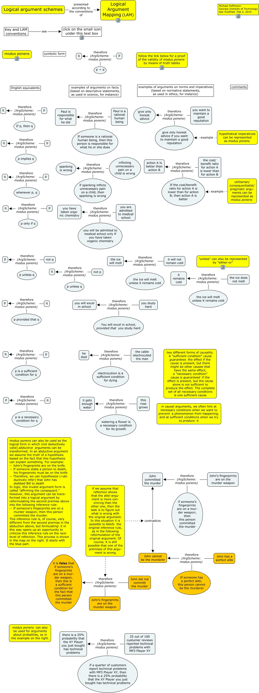 This Concept Map, created with IHMC CmapTools, has information related to: modus ponens, Paul is a rational human being therefore (ArgScheme: modus ponens) Paul is responsible for what he did, John did not committ the murder therefore (ArgScheme: modus ponens) it is false that if someone's fingerprints are on a mur- der weapon, then this is a sufficient condition for the fact that this person committed the murder, you will be admitted to medical school only if you have taken organic chemistry therefore (ArgScheme: modus ponens) you have taken orga- nic chemistry, not p therefore (ArgScheme: modus ponens) q, you want to maintain a good reputation therefore (ArgScheme: modus ponens) give only honest advice, p is a sufficient condition for q therefore (ArgScheme: modus ponens) q, if a quarter of customers report technical problems with MP3 Player XY, then there is a 25% probability that the XY Player you just bought has technical problems therefore (ArgScheme: modus ponens) there is a 25% probability that the XY Player you just bought has technical problems, if spanking inflicts unnecessary pain on a child, then spanking is wrong therefore (ArgScheme: modus ponens) spanking is wrong, p only if q therefore (ArgScheme: modus ponens) q, the ice does not melt therefore (ArgScheme: modus ponens) it remains cold, utilitarian/ consequentialist/ pragmatic argu- ments can be represented as modus ponens example If the cost/benefit ratio for action A is lower than for action B, then action A is better, give only honest advice if you want to maintain a good reputation therefore (ArgScheme: modus ponens) give only honest advice, the ice will melt unless it remains cold therefore (ArgScheme: modus ponens) it remains cold, if we assume that reflection shows that the alibi-argu- ment is more con- vincing than the other one, then the task is to figure out what is wrong with the original argument. In this situation it is possible to falsify the original inference rule, as in the following reformulation of the original argument. Of course, it is still possible that one of the premises of this argu- ment is wrong therefore (ArgScheme: modus ponens) it is false that if someone's fingerprints are on a mur- der weapon, then this is a sufficient condition for the fact that this person committed the murder, p → q therefore (ArgScheme: modus ponens) q, if we assume that reflection shows that the alibi-argu- ment is more con- vincing than the other one, then the task is to figure out what is wrong with the original argument. In this situation it is possible to falsify the original inference rule, as in the following reformulation of the original argument. Of course, it is still possible that one of the premises of this argu- ment is wrong contradicts John cannot be the murderer, hypothetical imperatives can be represented as modus ponens example give only honest advice if you want to maintain a good reputation, the ice will melt unless it remains cold therefore (ArgScheme: modus ponens) the ice will melt, John's fingerprints are on the murder weapon therefore (ArgScheme: modus ponens) it is false that if someone's fingerprints are on a mur- der weapon, then this is a sufficient condition for the fact that this person committed the murder, you study hard therefore (ArgScheme: modus ponens) you will excel in school