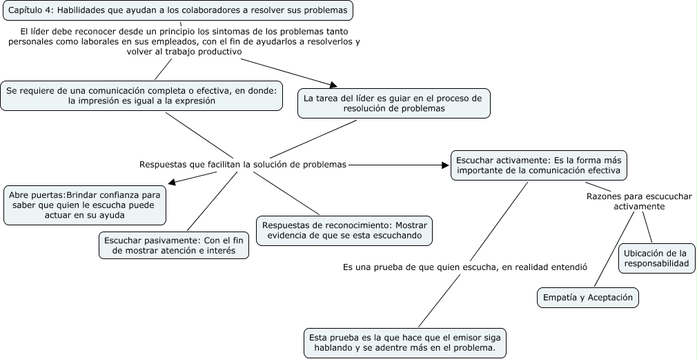 Este Cmap, tiene información relacionada con: Capitulos Gordon, Escuchar activamente: Es la forma más importante de la comunicación efectiva Razones para escucuchar activamente Ubicación de la responsabilidad, Capítulo 4: Habilidades que ayudan a los colaboradores a resolver sus problemas El líder debe reconocer desde un principio los sintomas de los problemas tanto personales como laborales en sus empleados, con el fin de ayudarlos a resolverlos y volver al trabajo productivo Se requiere de una comunicación completa o efectiva, en donde: la impresión es igual a la expresión, Se requiere de una comunicación completa o efectiva, en donde: la impresión es igual a la expresión Respuestas que facilitan la solución de problemas Escuchar pasivamente: Con el fin de mostrar atención e interés, Se requiere de una comunicación completa o efectiva, en donde: la impresión es igual a la expresión Respuestas que facilitan la solución de problemas Abre puertas:Brindar confianza para saber que quien le escucha puede actuar en su ayuda, Escuchar activamente: Es la forma más importante de la comunicación efectiva Razones para escucuchar activamente Empatía y Aceptación, Se requiere de una comunicación completa o efectiva, en donde: la impresión es igual a la expresión Respuestas que facilitan la solución de problemas Respuestas de reconocimiento: Mostrar evidencia de que se esta escuchando, La tarea del líder es guiar en el proceso de resolución de problemas Respuestas que facilitan la solución de problemas Respuestas de reconocimiento: Mostrar evidencia de que se esta escuchando, La tarea del líder es guiar en el proceso de resolución de problemas Respuestas que facilitan la solución de problemas Escuchar activamente: Es la forma más importante de la comunicación efectiva, Escuchar activamente: Es la forma más importante de la comunicación efectiva Es una prueba de que quien escucha, en realidad entendió Esta prueba es la que hace que el emisor siga hablando y se adentre más en el problema., Se requiere de una comunicación completa o efectiva, en donde: la impresión es igual a la expresión Respuestas que facilitan la solución de problemas Escuchar activamente: Es la forma más importante de la comunicación efectiva, La tarea del líder es guiar en el proceso de resolución de problemas Respuestas que facilitan la solución de problemas Abre puertas:Brindar confianza para saber que quien le escucha puede actuar en su ayuda, Capítulo 4: Habilidades que ayudan a los colaboradores a resolver sus problemas El líder debe reconocer desde un principio los sintomas de los problemas tanto personales como laborales en sus empleados, con el fin de ayudarlos a resolverlos y volver al trabajo productivo La tarea del líder es guiar en el proceso de resolución de problemas, La tarea del líder es guiar en el proceso de resolución de problemas Respuestas que facilitan la solución de problemas Escuchar pasivamente: Con el fin de mostrar atención e interés