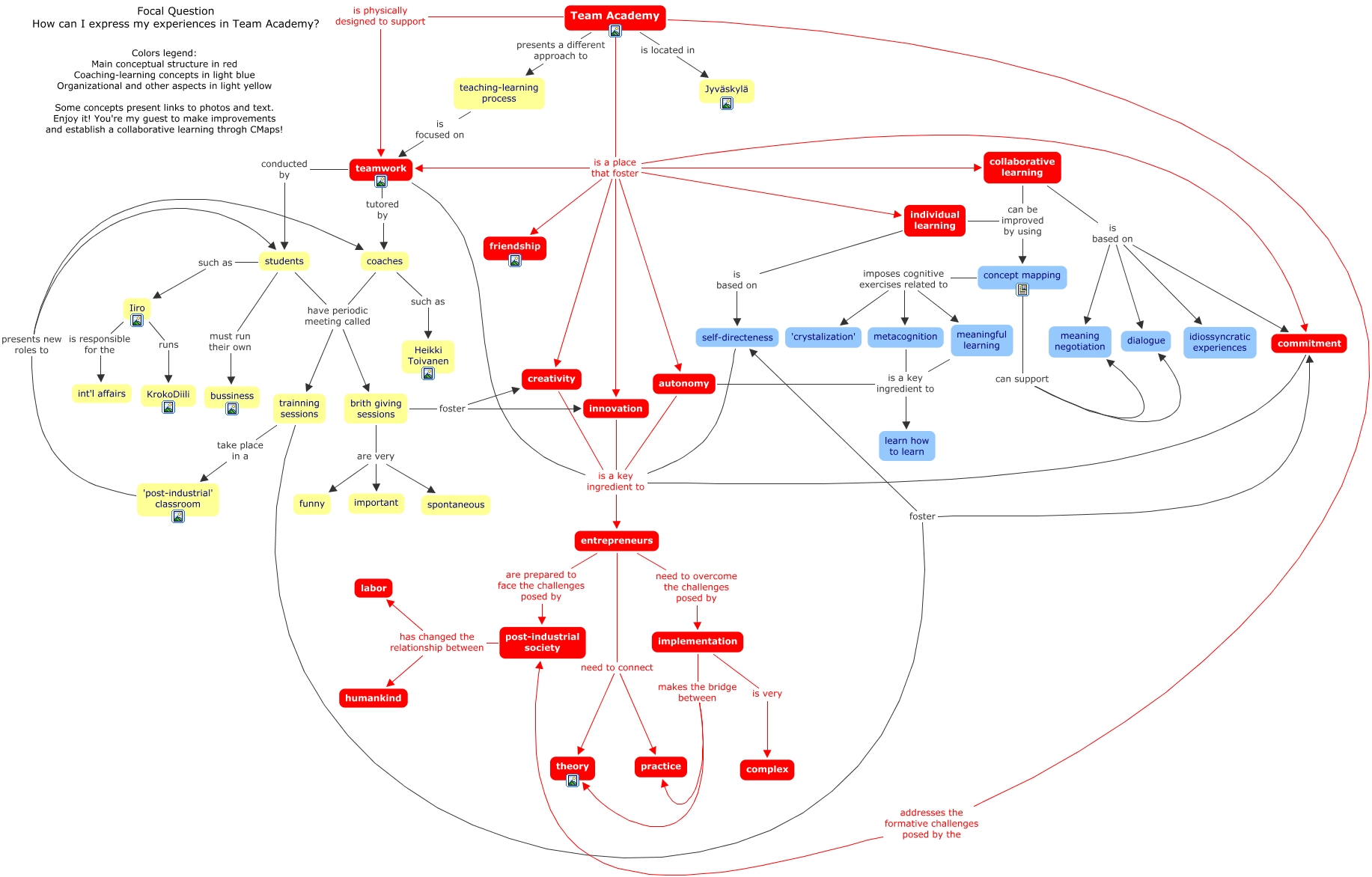 Esse mapa conceitual, produzido no IHMC CmapTools, tem a informação relacionada a: TA_version2, teamwork tutored by coaches, collaborative learning is based on commitment, entrepreneurs need to overcome the challenges posed by implementation, meaningful learning is a key ingredient to learn how to learn, autonomy is a key ingredient to entrepreneurs, post-industrial society has changed the relationship between labor, trainning sessions take place in a 'post-industrial' classroom, self-directeness is a key ingredient to entrepreneurs, Team Academy is located in Jyväskylä, individual learning is based on self-directeness, Team Academy addresses the formative challenges posed by the post-industrial society, commitment is a key ingredient to entrepreneurs, concept mapping imposes cognitive exercises related to meaningful learning, teaching-learning process is focused on teamwork, Iiro is responsible for the int'l affairs, coaches such as Heikki Toivanen, Team Academy is a place that foster autonomy, collaborative learning is based on idiossyncratic experiences, post-industrial society has changed the relationship between humankind, entrepreneurs need to connect theory