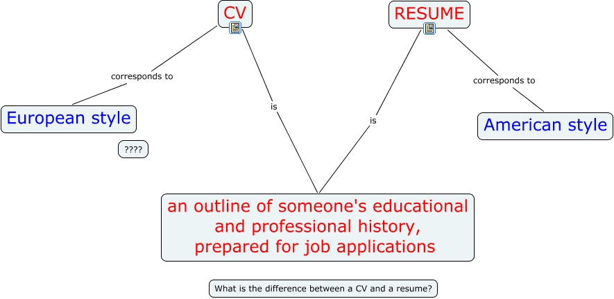 Tämä IHMC CmapToolsilla luotu käsitekartta sisältää tietoa, joka liittyy aiheeseen: Nimetön 2, RESUME is an outline of someone's educational and professional history, prepared for job applications, RESUME corresponds to American style, CV is an outline of someone's educational and professional history, prepared for job applications, CV corresponds to European style