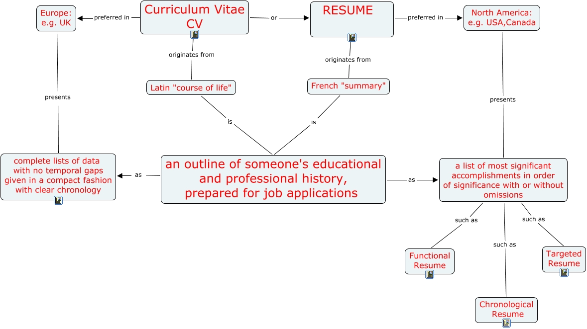 Tämä IHMC CmapToolsilla luotu käsitekartta sisältää tietoa, joka liittyy aiheeseen: CV and Resume, Europe: e.g. UK presents complete lists of data with no temporal gaps given in a compact fashion with clear chronology, Curriculum Vitae CV originates from Latin "course of life", North America: e.g. USA,Canada presents a list of most significant accomplishments in order of significance with or without omissions, Latin "course of life" is an outline of someone's educational and professional history, prepared for job applications, a list of most significant accomplishments in order of significance with or without omissions such as Functional Resume, an outline of someone's educational and professional history, prepared for job applications as a list of most significant accomplishments in order of significance with or without omissions, Curriculum Vitae CV or RESUME, Curriculum Vitae CV preferred in Europe: e.g. UK, RESUME preferred in North America: e.g. USA,Canada, a list of most significant accomplishments in order of significance with or without omissions such as Targeted Resume, RESUME originates from French "summary", a list of most significant accomplishments in order of significance with or without omissions such as Chronological Resume, French "summary" is an outline of someone's educational and professional history, prepared for job applications, an outline of someone's educational and professional history, prepared for job applications as complete lists of data with no temporal gaps given in a compact fashion with clear chronology