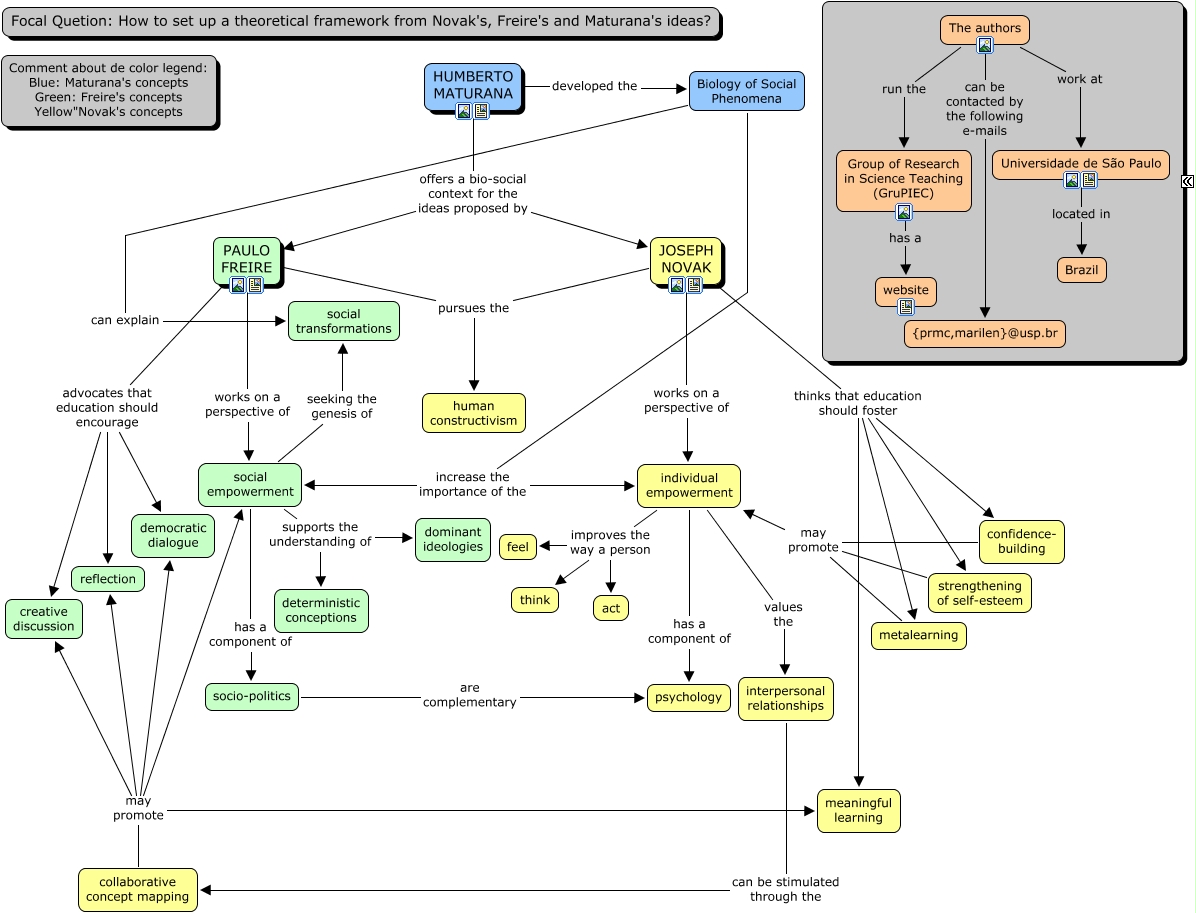 Esse mapa conceitual, produzido no IHMC CmapTools, tem a informação relacionada a: Empowerment and Education_v3, The authors run the Group of Research in Science Teaching (GruPIEC), individual empowerment improves the way a person feel, HUMBERTO MATURANA developed the Biology of Social Phenomena, JOSEPH NOVAK works on a perspective of individual empowerment, social empowerment supports the understanding of deterministic conceptions, JOSEPH NOVAK thinks that education should foster metalearning, JOSEPH NOVAK pursues the human constructivism, PAULO FREIRE advocates that education should encourage democratic dialogue, individual empowerment values the interpersonal relationships, PAULO FREIRE advocates that education should encourage creative discussion, individual empowerment has a component of psychology, interpersonal relationships can be stimulated through the collaborative concept mapping, strengthening of self-esteem may promote individual empowerment, The authors can be contacted by the following e-mails {prmc,marilen}@usp.br, individual empowerment improves the way a person act, Biology of Social Phenomena increase the importance of the social empowerment, PAULO FREIRE advocates that education should encourage reflection, PAULO FREIRE works on a perspective of social empowerment, social empowerment supports the understanding of dominant ideologies, collaborative concept mapping may promote creative discussion