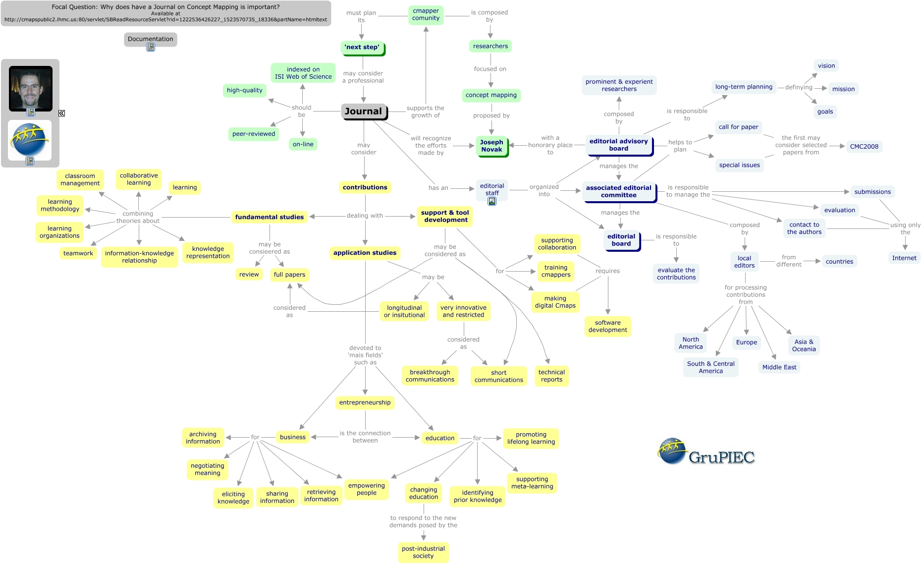 Esse mapa conceitual, produzido no IHMC CmapTools, tem a informação relacionada a: Journal on Cmapping, support & tool development may be considered as full papers, making digital Cmaps requires software development, business for archiving information, local editors from different countries, fundamental studies combining theories about classroom management, support & tool development for training cmappers, fundamental studies combining theories about knowledge representation, long-term planning definying mission, researchers focused on concept mapping, editorial advisory board is responsible to long-term planning, longitudinal or insitutional considered as full papers, application studies devoted to 'mais fields' such as education, support & tool development may be considered as technical reports, fundamental studies combining theories about collaborative learning, fundamental studies combining theories about learning, contributions dealing with application studies, concept mapping proposed by Joseph Novak, business for sharing information, entrepreneurship is the connection between business, Journal should be on-line