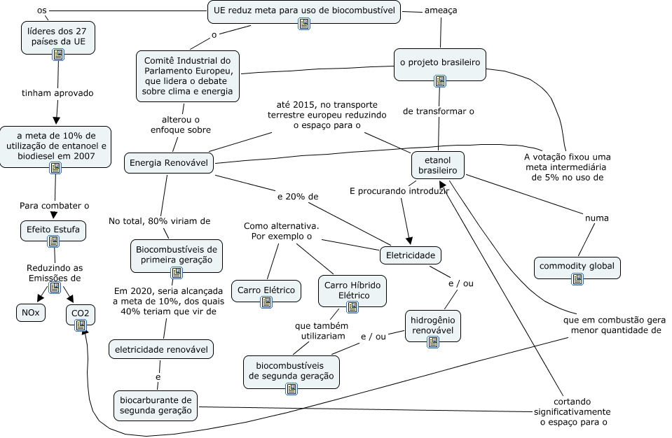 Esse mapa conceitual, produzido no IHMC CmapTools, tem a informação relacionada a: UE reduz meta para uso de biocombustível v2, hidrogênio renovável e / ou biocombustíveis de segunda geração, UE reduz meta para uso de biocombustível os líderes dos 27 países da UE, Comitê Industrial do Parlamento Europeu, que lidera o debate sobre clima e energia A votação fixou uma meta intermediária de 5% no uso de Energia Renovável, Eletricidade Como alternativa. Por exemplo o Carro Elétrico, Efeito Estufa Reduzindo as Emissões de CO2, Carro Híbrido Elétrico que também utilizariam biocombustíveis de segunda geração, UE reduz meta para uso de biocombustível ameaça o projeto brasileiro, etanol brasileiro E procurando introduzir Eletricidade, Energia Renovável e 20% de Eletricidade, UE reduz meta para uso de biocombustível o Comitê Industrial do Parlamento Europeu, que lidera o debate sobre clima e energia, Energia Renovável até 2015, no transporte terrestre europeu reduzindo o espaço para o etanol brasileiro, biocarburante de segunda geração cortando significativamente o espaço para o etanol brasileiro, líderes dos 27 países da UE tinham aprovado a meta de 10% de utilização de entanoel e biodiesel em 2007, etanol brasileiro que em combustão gera menor quantidade de CO2, Energia Renovável No total, 80% viriam de Biocombustíveis de primeira geração, Biocombustíveis de primeira geração Em 2020, seria alcançada a meta de 10%, dos quais 40% teriam que vir de eletricidade renovável, Eletricidade Como alternativa. Por exemplo o Carro Híbrido Elétrico, Efeito Estufa Reduzindo as Emissões de NOx, eletricidade renovável e biocarburante de segunda geração, a meta de 10% de utilização de entanoel e biodiesel em 2007 Para combater o Efeito Estufa
