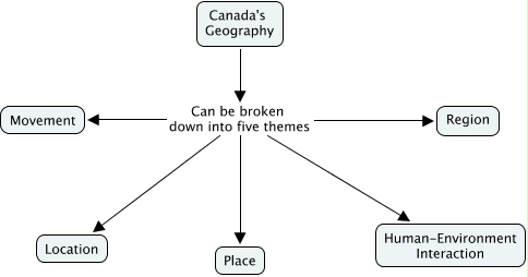 This Concept Map, created with IHMC CmapTools, has information related to: Canada's Geography, Canada's Geography Can be broken down into five themes Region, Canada's Geography Can be broken down into five themes Place, Canada's Geography Can be broken down into five themes Human-Environment Interaction, Canada's Geography Can be broken down into five themes Movement, Canada's Geography Can be broken down into five themes Location