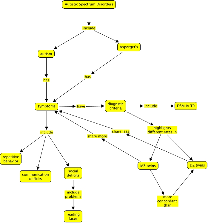 This Concept Map, created with IHMC CmapTools, has information related to: Autism_JC, MZ twins share more symptoms, autism has symptoms, Autistic Spectrum Disorders include Asperger's, diagnstic criteria highlights different rates in DZ twins, symptoms include repetitive behavior, social deficits include problems reading faces, symptoms include social deficits, Autistic Spectrum Disorders include autism, symptoms have diagnstic criteria, diagnstic criteria highlights different rates in MZ twins, Asperger's has symptoms, MZ twins more concordant than DZ twins, DZ twins share less symptoms, diagnstic criteria include DSM IV TR, symptoms include communication deficits