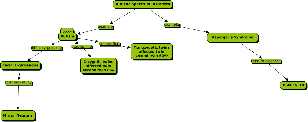 This Concept Map, created with IHMC CmapTools, has information related to: Denise concept map, Autism studies find Dizygotic twins affected twin second twin 0%, Asperger's Syndrome used to diagnose DSM-IV-TR, Autism difficulty grasping Facial Expressions, Autistic Spectrum Disorders example Asperger's Syndrome, Autism studies find Monozygotic twins affected twin second twin 60%, Autistic Spectrum Disorders example Autism, Facial Expressions scientists study Mirror Neurons