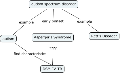 This Concept Map, created with IHMC CmapTools, has information related to: rynyr, autism spectrum disorder example Rett's Disorder, autism spectrum disorder example autism, autism find characteristics DSM-IV-TR, Asperger's Syndrome ???? DSM-IV-TR, autism spectrum disorder early onnset Asperger's Syndrome