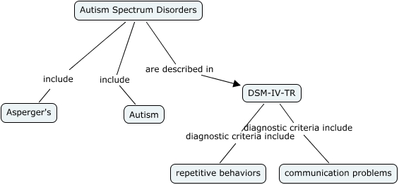 This Concept Map, created with IHMC CmapTools, has information related to: fgfg, Autism Spectrum Disorders are described in DSM-IV-TR, Autism Spectrum Disorders include Asperger's, DSM-IV-TR diagnostic criteria include repetitive behaviors, Autism Spectrum Disorders include Autism, DSM-IV-TR diagnostic criteria include communication problems